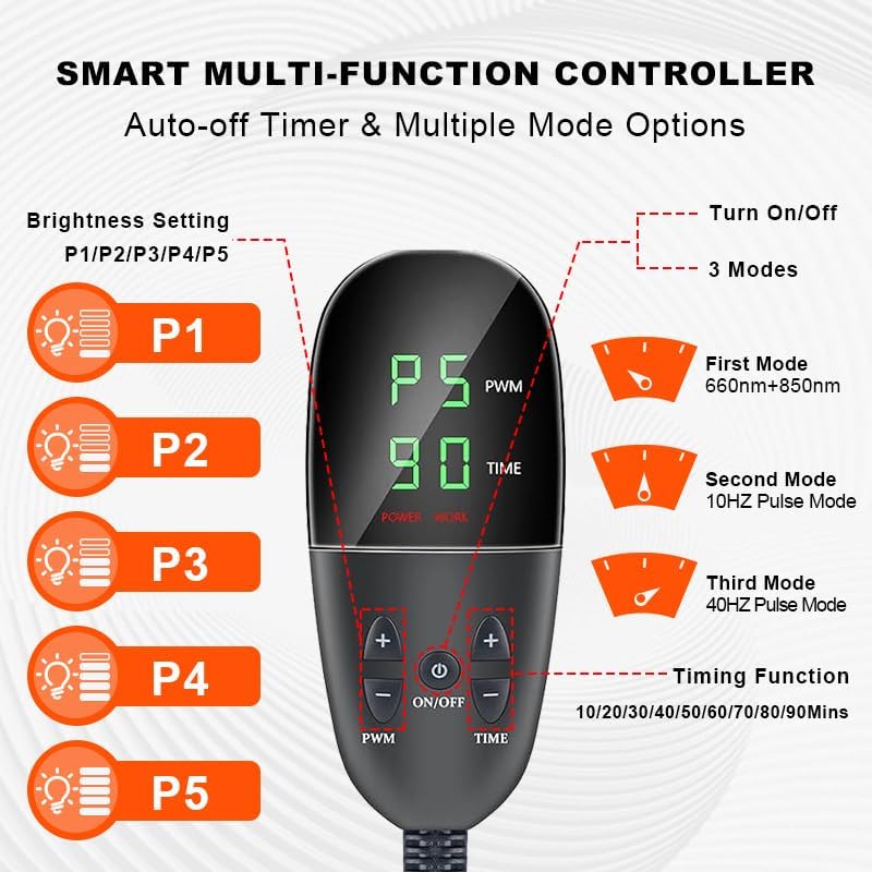 Multifunctioneel – Dit roodlichttherapie taille pijnverlichtingspad met 5 TWEE VERLICHTINGSMODUS, VIJF LICHT INTENSITEIT, 2 PULSING RATE, 10-90 MINS SET, U kunt de juiste modus kiezen op basis van het type en het niveau van lichaamspijn.