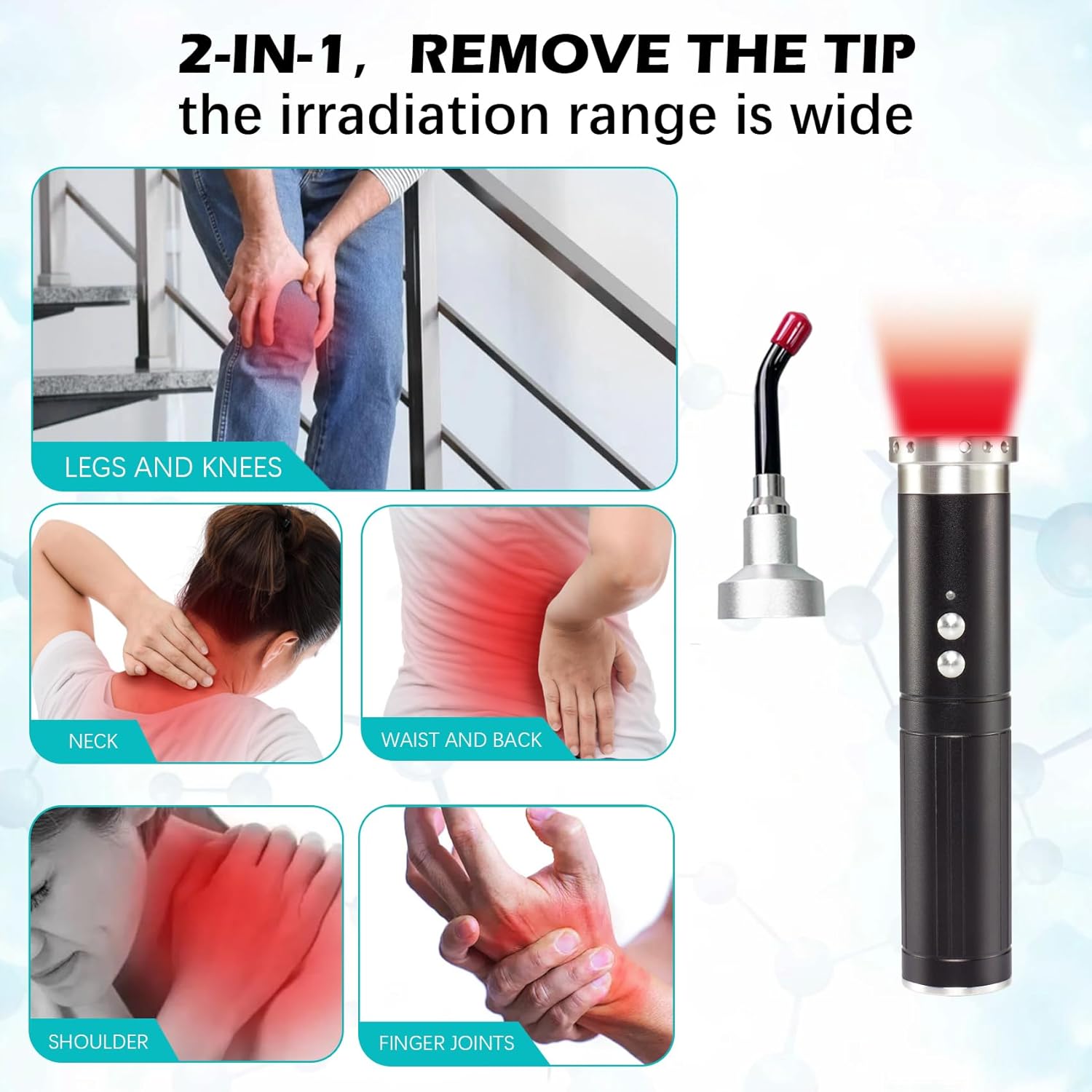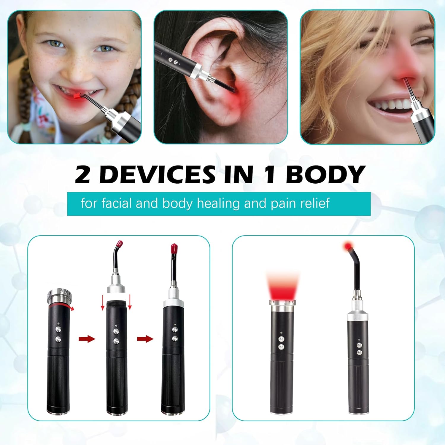 2-in-1 gezichts- en lichaam: Ons roodlichttherapie-apparaat wordt geleverd met een afneembare punt. Het is een gezichtstherapie-apparaat en gericht op mond, neus en oor met tip op. Geweldig voor koortslip. Aften, koortsblaasjesbehandeling voor lippen. Verwijder de tip, het kan een pijnstillend apparaat en genezingsapparaat zijn voor nek, schouder, pols, vinger, taille, knie, enkel, gewrichten enz.