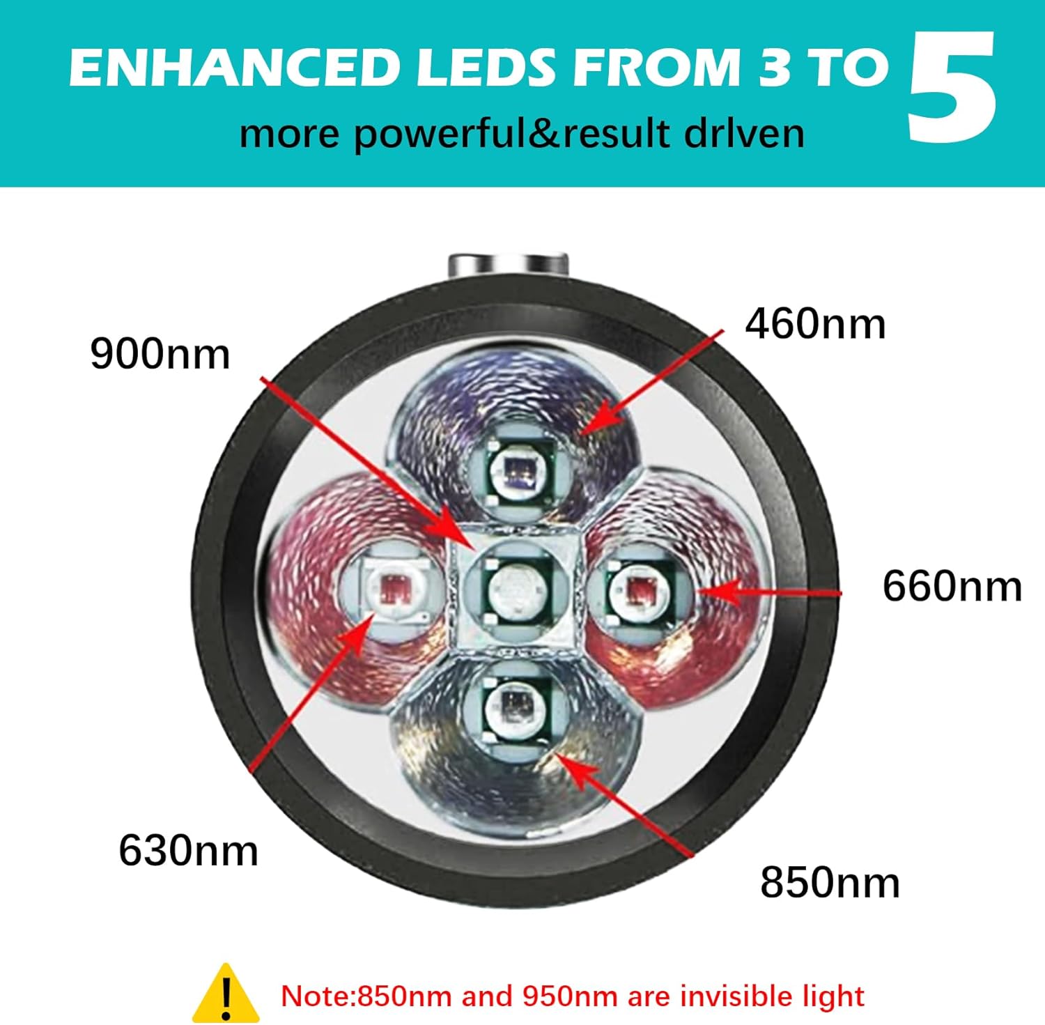 Verbeterde golflengten: Het is bewezen dat golflengten van rood en infrarood licht gunstig zijn voor het lichaam. opgewaardeerd rood lichttherapieapparaat met zijn 5 LED-lampjes en 5 golflengten 900nm-660nm-850nm-630nm-460nm. Het wordt door het lichaam opgenomen en helpt bij genezing, pijnverlichting, bloedcirculatie, spierherstel Houd er rekening mee dat 850nm en 900nm niet zichtbaar zijn voor blote ogen en wanneer ze worden ingeschakeld. Als je het vanaf de zijkant goed bekijkt, zie je dat het licht een beetje rood is