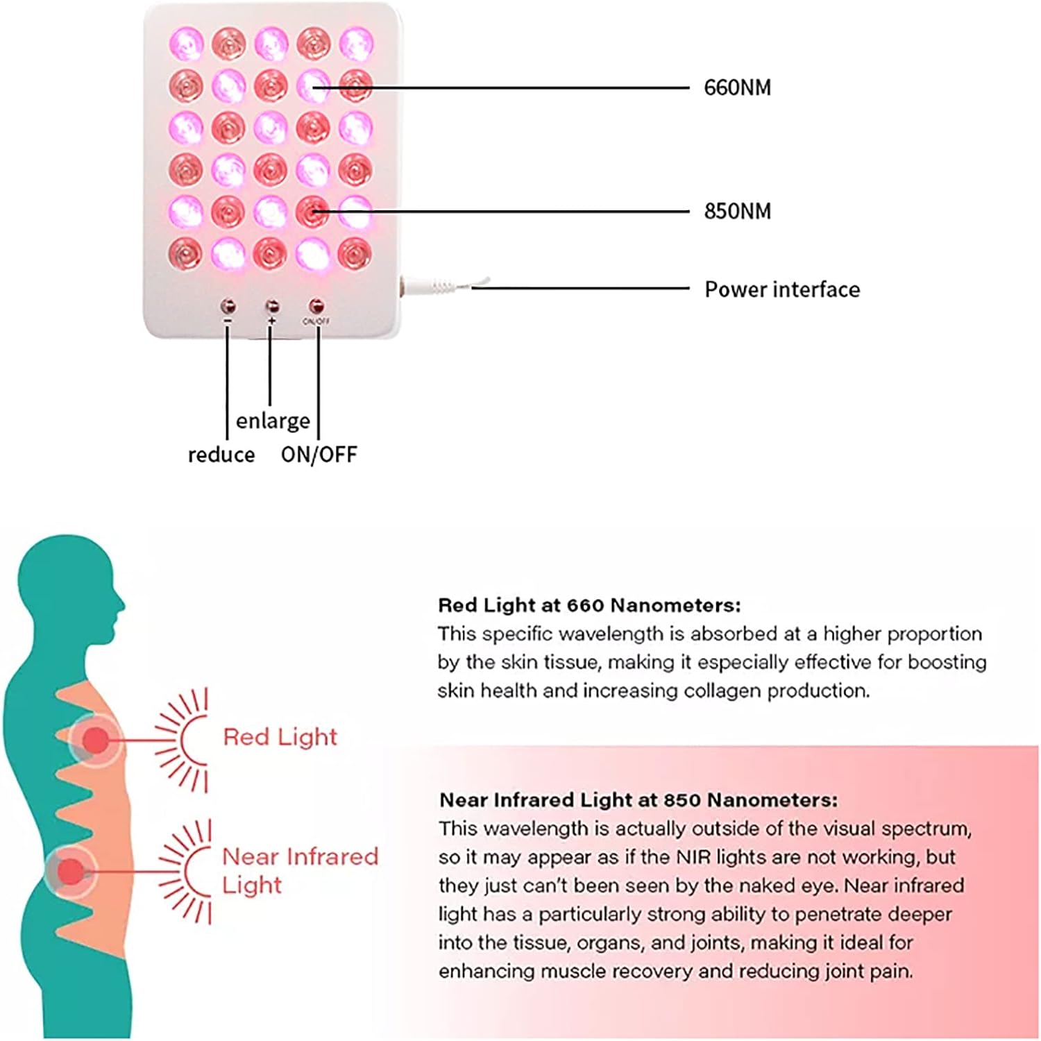 【Gunstige golflengte】 Roodlichttherapie-apparatuur is het beste voor oppervlakkige (oppervlakte) huidbehandeling omdat het niet diep in de huid doordringt, terwijl nabij-infrarood het beste is voor diepe weefsel-, spier- en gewrichtsbehandeling, het kan helpen bij het verbeteren van gewrichtsrugpijn , enz.