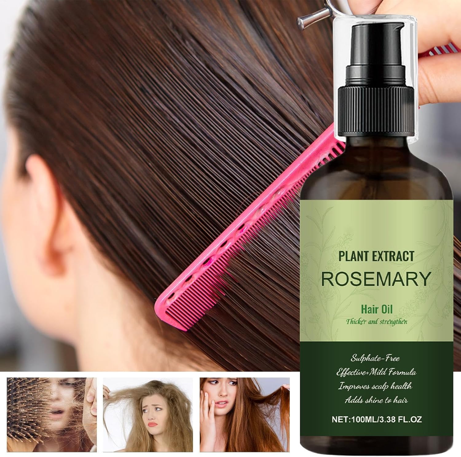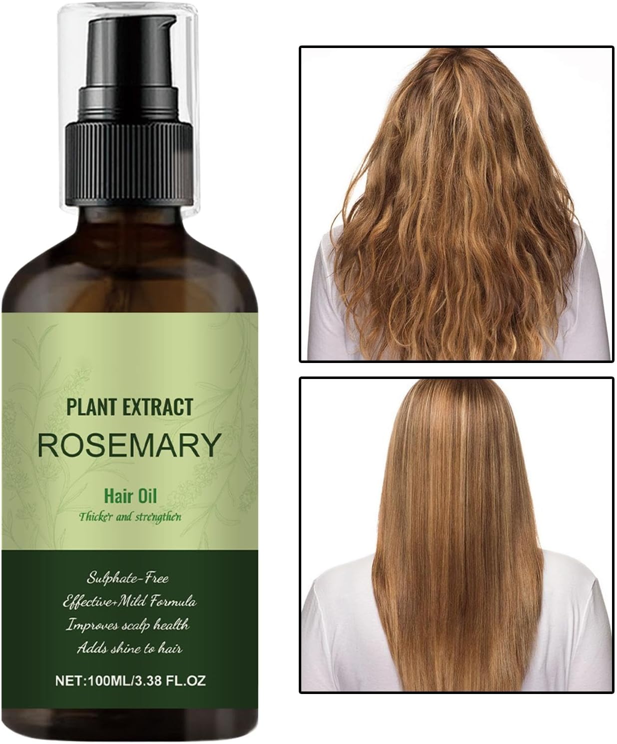 Diep hydraterend: doordrenkt met diepe vochtinbrengende crèmes, houdt deze rozemarijn haarolie het haar gehydrateerd, voedt het diep en herstelt de natuurlijke glans, waardoor de gladde stijl van het haar behouden blijft