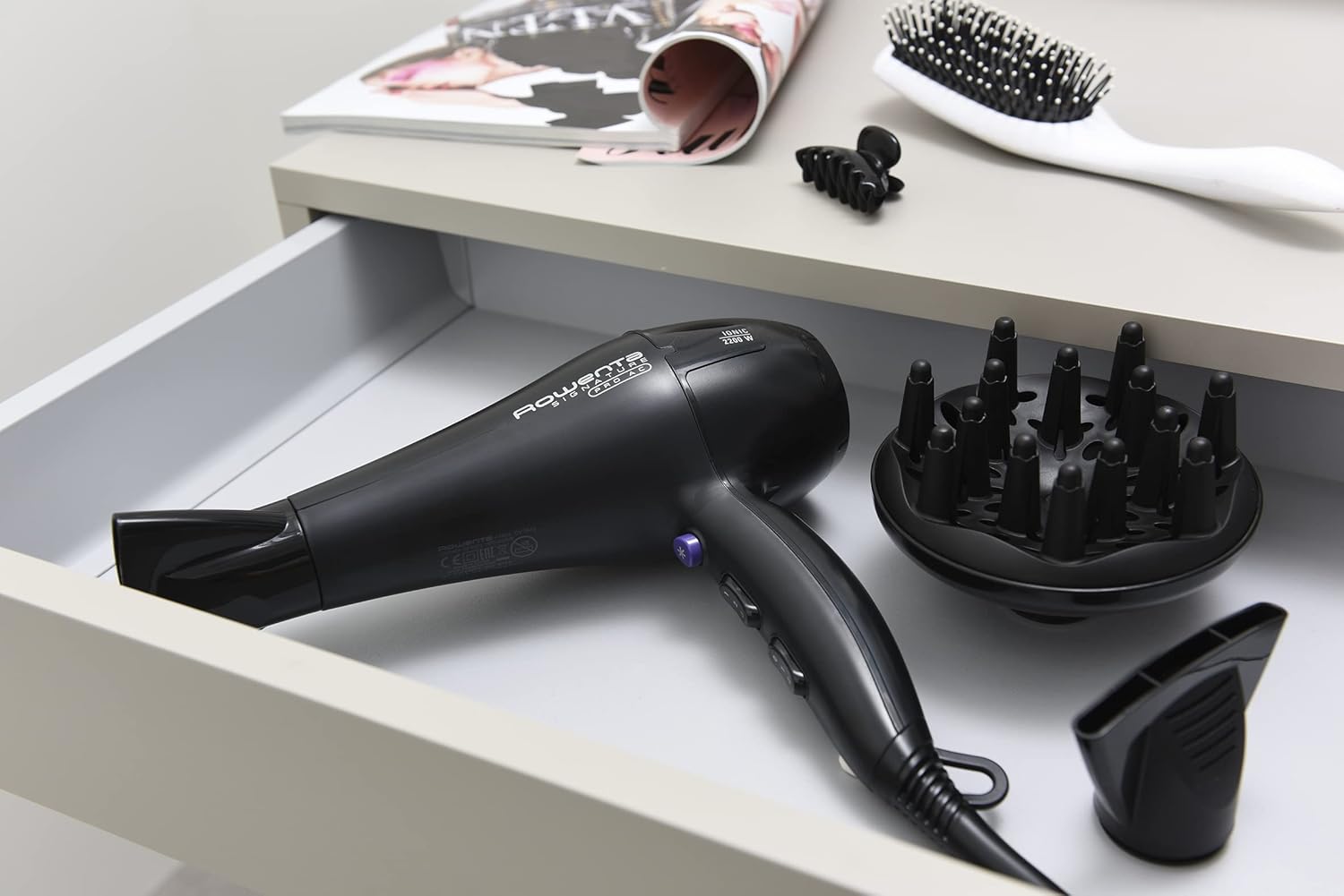 Rowenta Signature Pro CV7840 Professionele haardroger, 2200 W AC-motor, ionenfunctie, 2 snelheden en 3 temperatuurinstellingen met concentratorsproeiers en diffuser. Rowenta Signature Pro CV7840 uitneembaar rooster voor eenvoudige reiniging zorgt voor een lange levensduur. Ionengenerator: ionenemissie concentreert de watermoleculen in het haar en vermindert statische elektriciteit en kroezen voor glad en handig haar. De professionele AC-motor garandeert een lange levensduur en duurzaamheid, terwijl de hoge luchtsnelheid van maximaal 100 km/u hoogwaardige resultaten levert. 2 snelheden en 3 instelbare temperatuurinstellingen voor glanzend en licht stylen van het haar. Dunne en ultradunne concentraatmondstukken met elk 9 mm breedte en 7 mm garanderen een hogere droognauwkeurigheid en een mooie afwerking. Diffuser voor natuurlijk volume in krullend haar en koude luchtslag om het kapsel aan het einde van de droogsessie te fixeren.