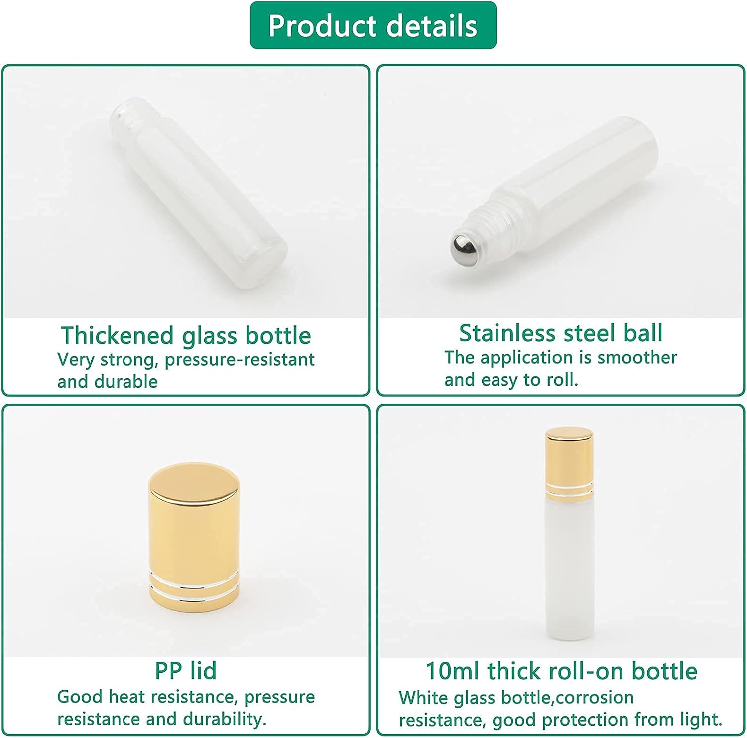 Premium & Anti-lek Materiaal – Gemaakt van verdikte drukbestendige glazen fles lichaam met gouden dop en gladde roestvrijstalen rolbal zorgen voor geen lekken en een goede massageervaring