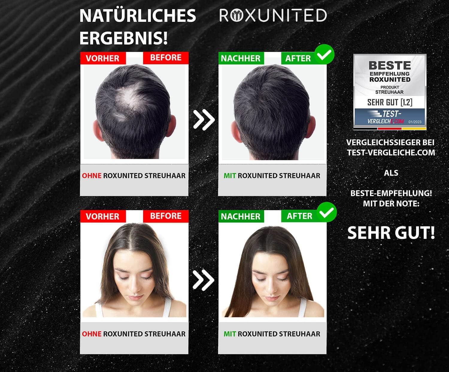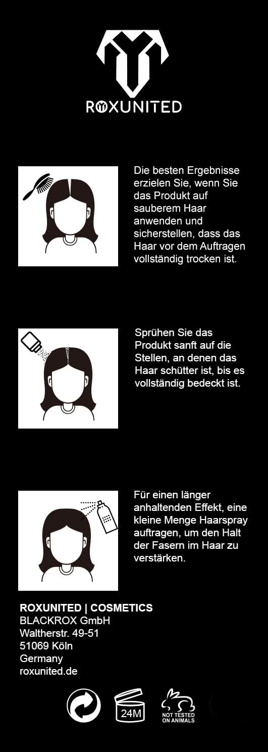 Het Roxunited Cosmetics strooihaar kan in een paar eenvoudige stappen worden aangebracht. Het haar wordt voller en volumineuzer, zonder er kunstmatig uit te zien. Lichte plekken worden verborgen, zodat het er volledig natuurlijk uitziet.