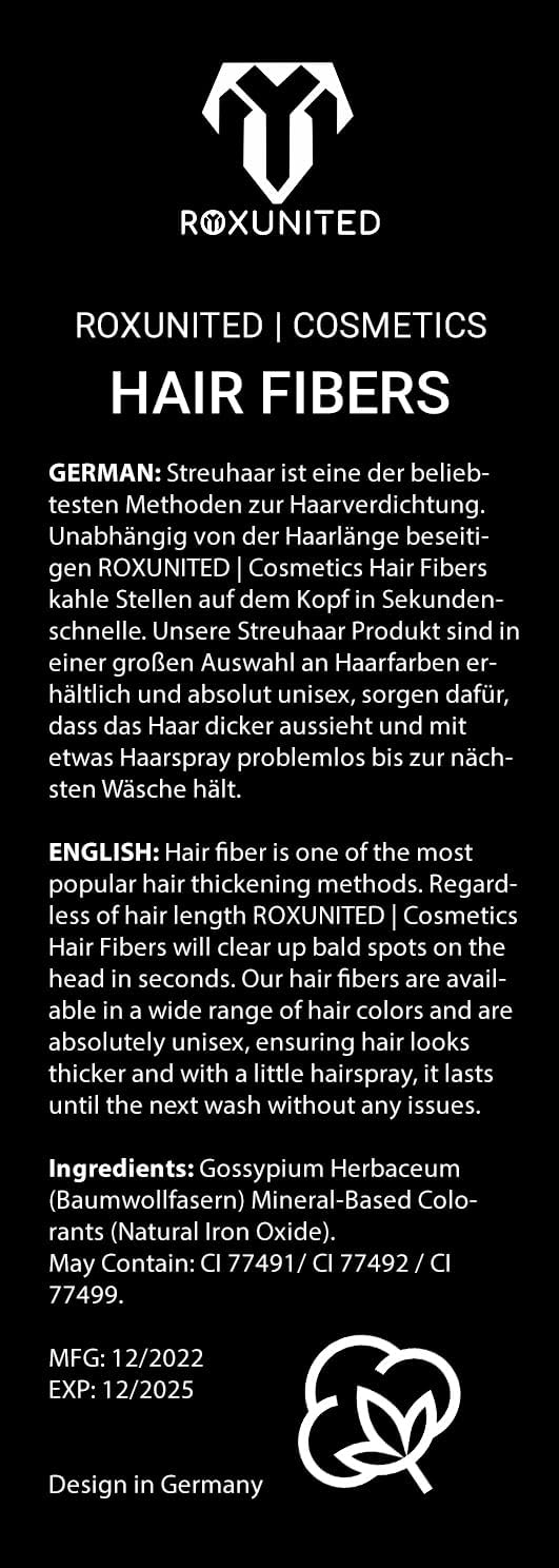 De productie van het haarstukje van ROXUNITED gebeurt uit 100% katoenvezels. Het is een natuurlijk materiaal dat zacht is voor de huid en perfect met je eigen haar verbindt. Of het nu bij haaruitval of bij licht haar is, het Roxunited Cosmetics strooihaar is de optimale oplossing en wordt ook door haarstylisten altijd aanbevolen. Wij zien bij de productie volledig af van minerale oliën, siliconen, microplastic, hormonen, parabenen, PEG’s en dierlijke producten, zodat een veganistisch product is ontstaan dat ook uitstekend geschikt is voor mensen met een allergie.