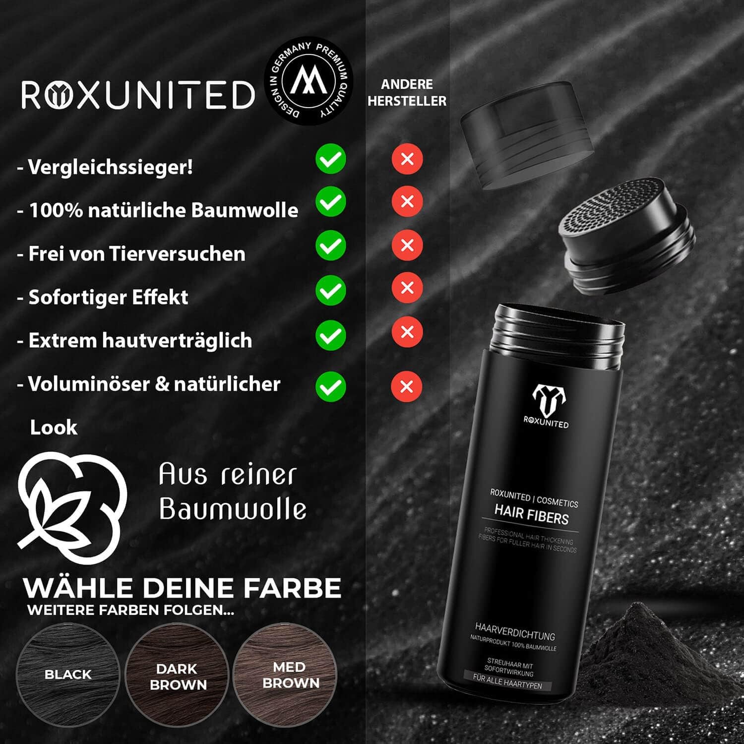 Natuurlijkheid: ons RoxUNITED Cosmetics strooihaar bestaat voor 100% uit natuurlijke katoenvezels, die zeer op het haar lijken. Ze zijn huidvriendelijk en veroorzaken geen allergieën. Vanwege hun natuurlijkheid zijn ze ook geschikt voor mensen met een allergie die een vol haar wensen.