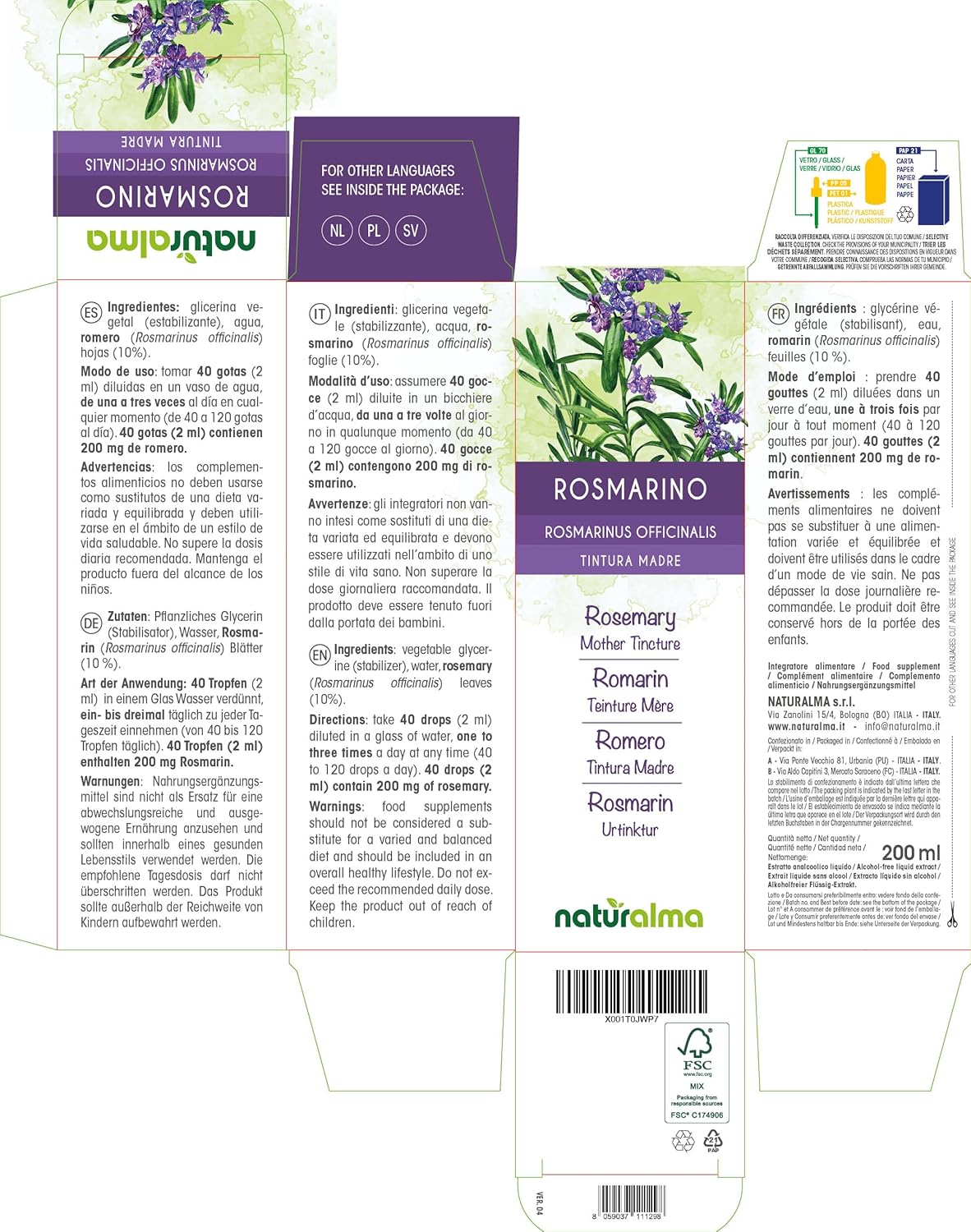 Voedingssupplement moedertinctuur in druppels op basis van het extract van Rozemarijn (Rosmarinus officinalis) bladeren geconcentreerd (1:10) en zeer zuiver, 100% natuurlijk. Alle NATURALMA-moedertincturen zijn bereid met behulp van een exclusieve extractiemethode, waarmee de maximale concentratie aan actieve ingrediënten wordt verkregen. Ze zijn 100% alcoholvrij en volledig natuurlijk, hebben een aangename smaak en bevatten geen toegevoegde suiker. Dit supplement wordt geproduceerd en verpakt in Italië. Glycerine is een 100% natuurlijke, caloriearme zoetstof van plantaardige oorsprong. Bewaren: het product kan bij kamertemperatuur worden bewaard tot de vervaldatum vermeld op de verpakking. Glycerinemaceraat of volkomen vloeibaar extract van Rozemarijn (Rosmarinus officinalis) bladeren in druppels.
