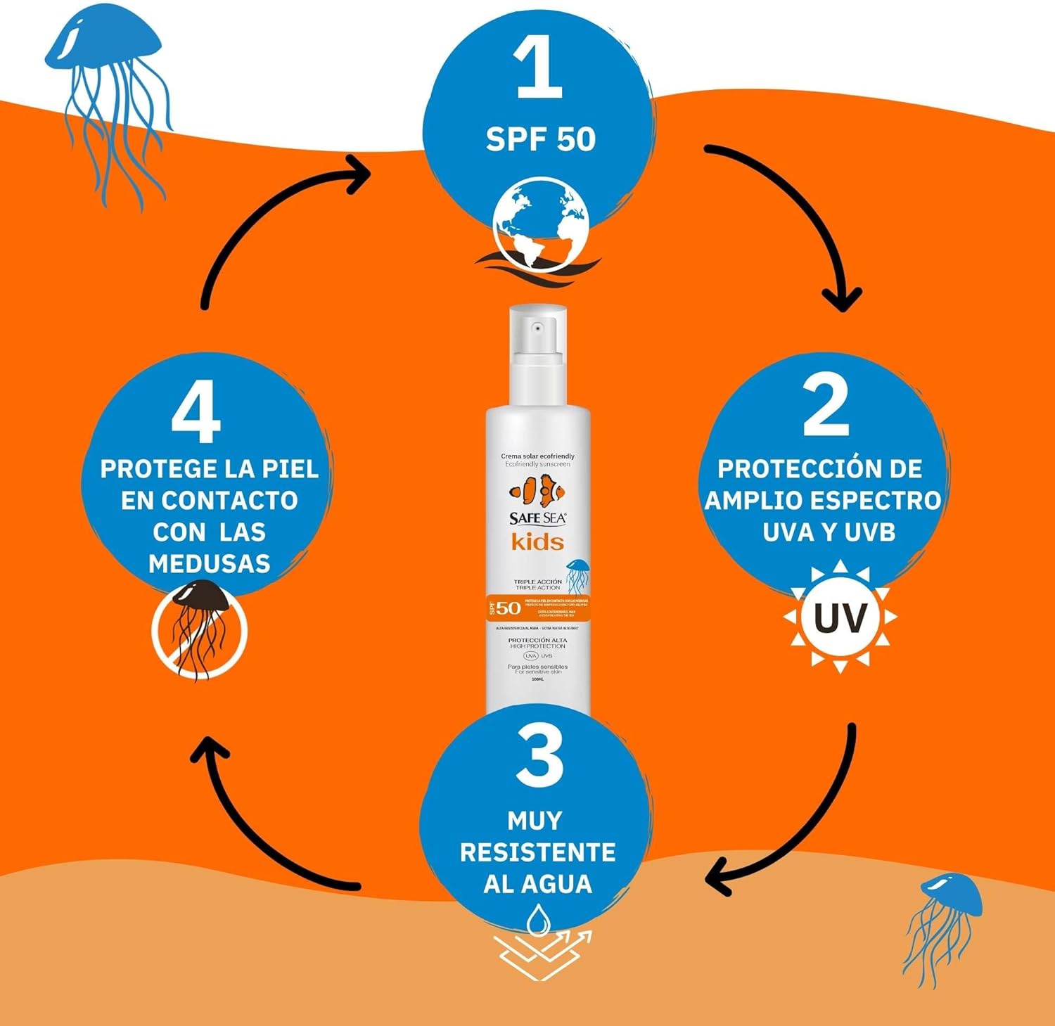 Protección solar que a pesar de poner que protege contra las medusas, no es cierto. Su olor no es muy agradable.