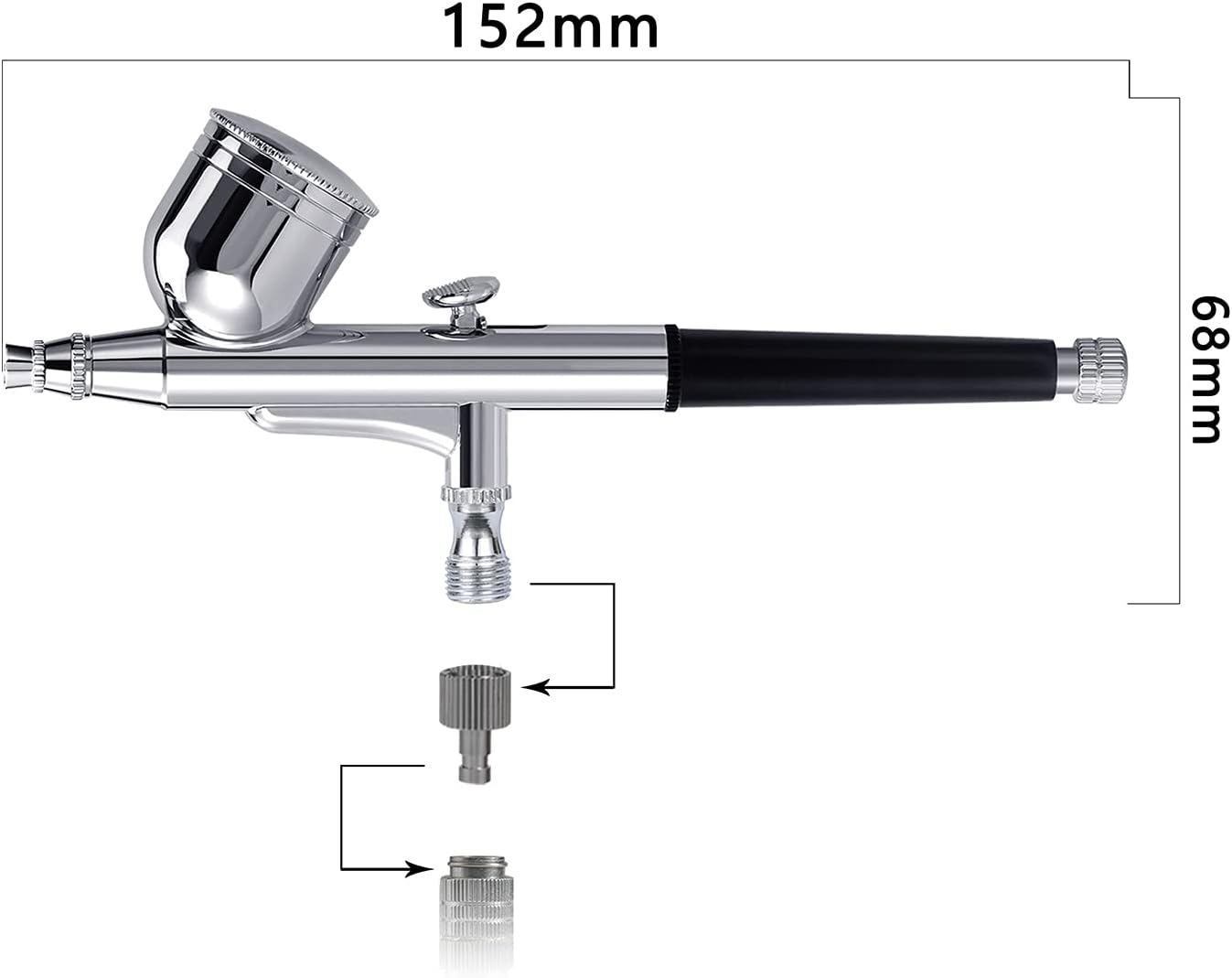 Airbrush kit: Air Brush Kit is 0.3mm airbrush set with 0.3mm spray head counter needle. The content is 1/3 oz. SAGUD airbrushes are all equipped with quick coupling and a set of airbrush O-ring.