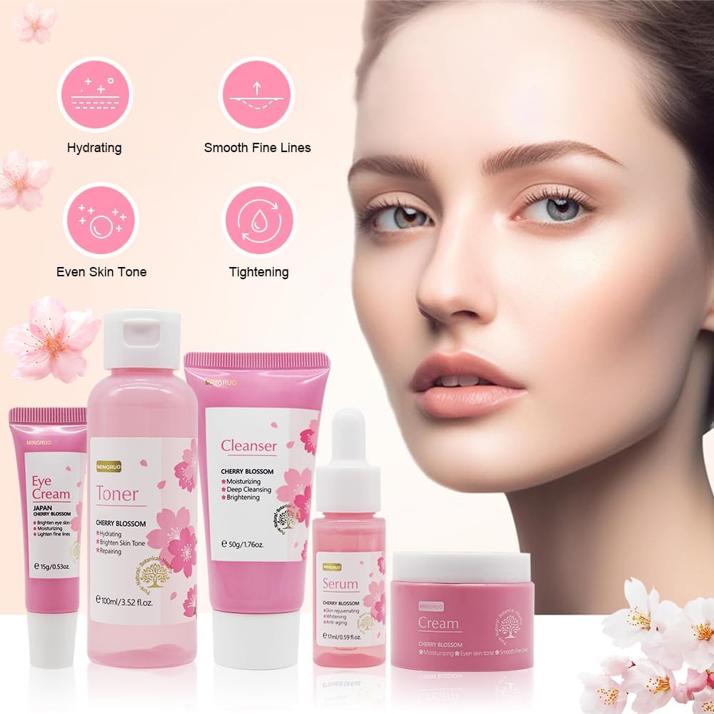 Sakura Huidverzorgingsset, 5-delige huidverzorgingsset, Sakura huidverzorgingsset, hydraterende verzorgingsset voor vrouwen, gezichtsgereedschap met kersenbloesemextract