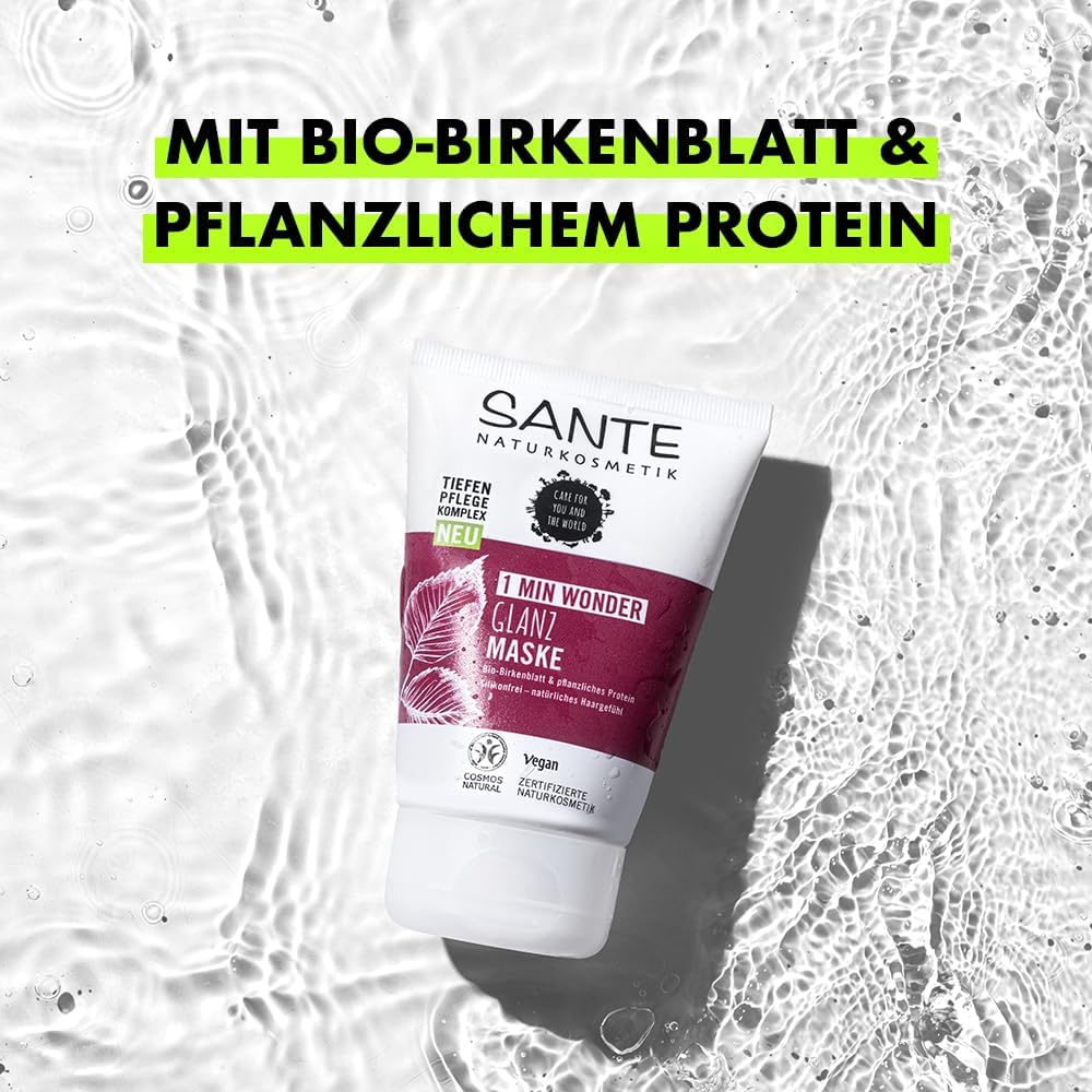 SANTE Naturkosmetik FAMILY 1 min Wonder Glansmasker, siliconenvrij haarmasker met bio-berkenbladextract en plantaardige eiwitten, veganistische haarverzorging voor merkbaar meer glans en soepelheid,