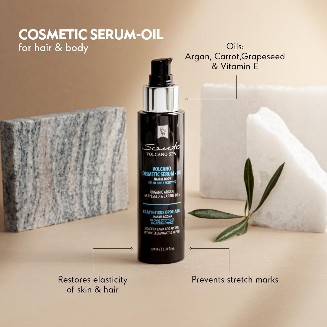 Ons multifunctionele cosmetische serum op oliebasis van Santo Volcano is perfect voor de dagelijkse verzorging van je lichaam en haar. Het serum zit vol voedende natuurlijke oliën en is ook verrijkt met vitamine E, dat antioxiderende eigenschappen heeft, zorgt voor huidregeneratie en beschermt tegen schadelijke omgevingsfactoren. Het serum revitaliseert de vochtarme en doffe huid perfect, herstelt de structuur en helpt je om oneffenheden zoals striae, cellulitis, hyperpigmentatie enz. te verwijderen. Het kan ook worden gebruikt in de haarverzorging, vooral voor droog en beschadigd haar met gespleten punten. Het serum voedt en hydrateert de hoofdhuid diep, geneest de gespleten haarpunten en maakt het haar glanzend. Zo veelzijdig als je maar kunt wensen. En als bonus kun je genieten van een zoete zomergeur die je meteen terugbrengt naar je vakantie! ACTIEVE INGREDIËNTEN: arganolie, druivenpitolie, wortelolie. VOORDELEN: 1. Verzorgt de vochtarme huid en herstelt de oorspronkelijke elasticiteit; 2. Revitaliseert droog en beschadigd haar; 3. Voorkomt striae, cellulitis en andere huidonvolkomenheden; 4. Kalmeert en hydrateert de huid van je lichaam en hoofdhuid; 5. Egaliseert de huidskleur en versnelt het bruinen;