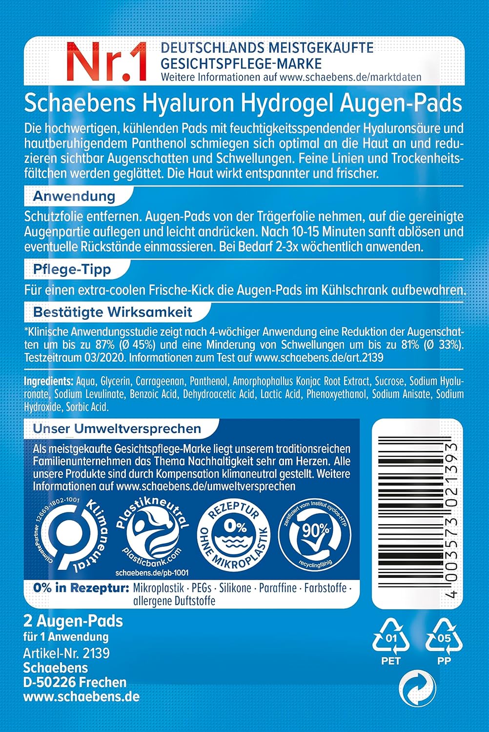 Schaebens Hyaluron Hydrogel oogpads hydrateren en verminderen donkere kringen met hyaluronzuur en panthenol voor alle huidtypes