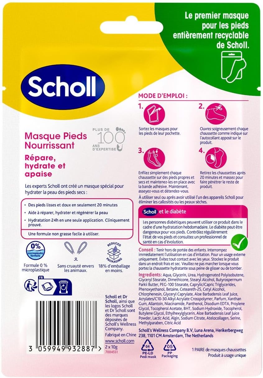 La peau de mes pieds étant trop sec, j’ai décidé de faire un soin exfoliant (pour enlever la peau “endommagée) + un soin hydratant de scholl.Pour le soin hydratant de scholl, ça nourri très bien. Il y en a bien 3 dans le paquet. C’est facile à mettre : comme de grosses chaussettes dont la languette collante permet de les refermer.La peau de mes pieds est devenue lisse à telle point qu’elle ne s’accroche plus dans mes draps en satin (pour ceux qui comprennent ahah).Je recommande le produit, et j’en recommenderai ici.