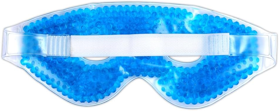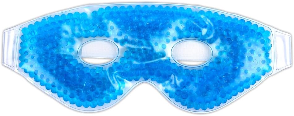 Oogmasker met blauwe gel-parels; vermindering van kringen onder de ogen, vermindering van migraine en hoofdpijn; verlichting bij zonnebrand en allergieën; vermindert rimpels en zwellingen