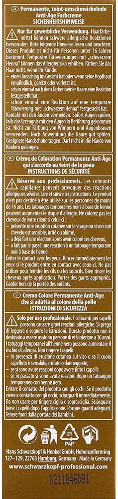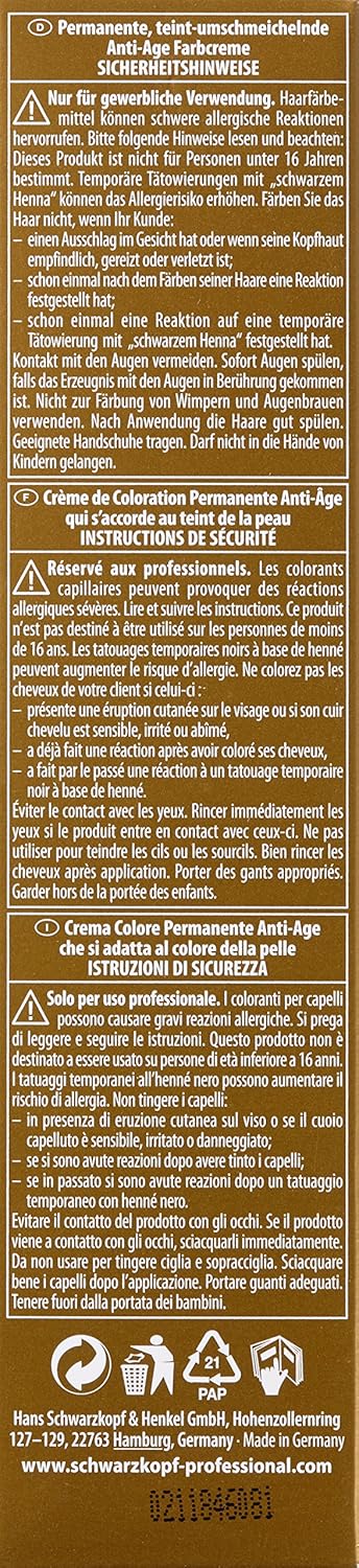 Hair dye for river hair with anti-aging technology, 100% coverage thanks to microfine, concentrated colour pigments up to 3 levels, bright colours with any white content with collagen. In various nuances, the new Schwarzkopf Igora Royal Absolute are based on absolutely the most modern anti-aging technology. This unique formula contributes to the strengthening of the hair structure and gives refined, mature hair an irresistible shine. The Age Blend nuances flatter the complexion and adapt to the paler complexion of mature skin. Brand Name:Schwarzkopf. Article number: 60961 barcode – single article: 4045787281583.