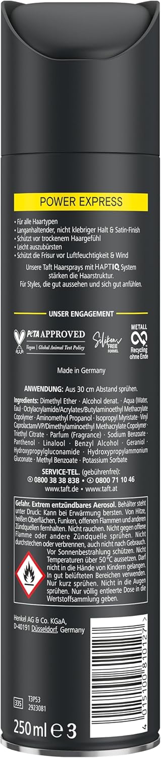 Taft Power Express haarspray: droogt direct, geschikt voor alle haartypes. De innovatieve Taft Power Express formule droogt direct en geeft het haar een zijdeachtige afwerking. Voor langdurige grip zonder te plakken, terwijl het gemakkelijk uit te borstelen is. De sneldrogende Taft haarspray helpt om het haar te beschermen tegen het gevoel van droogheid. Deze styling-haarspray met snelle droging houdt je styling zelfs onder ongunstige weersomstandigheden zoals vocht en wind vast. Deze Taft haarspray bevat het HAPTIQ-systeem om microbindingen te creëren en de haarstructuur te versterken. Voor prachtige kapsels die je kunt zien en voelen. Taft haarsprays gebruiken veganistische formules* en zijn PETA** gecertificeerd. De formule is vrij van siliconen. Gebruik: Spuit op een afstand van 30 cm. Productvoordelen in detail: Droogt direct Geschikt voor alle haartypes Langdurige grip, dankzij de houdgraad 5 bescherming tegen vocht en wind Veganistische formule* door PETA** gecertificeerd * Vrij van dierlijke ingrediënten ** Global Animal Test Policy