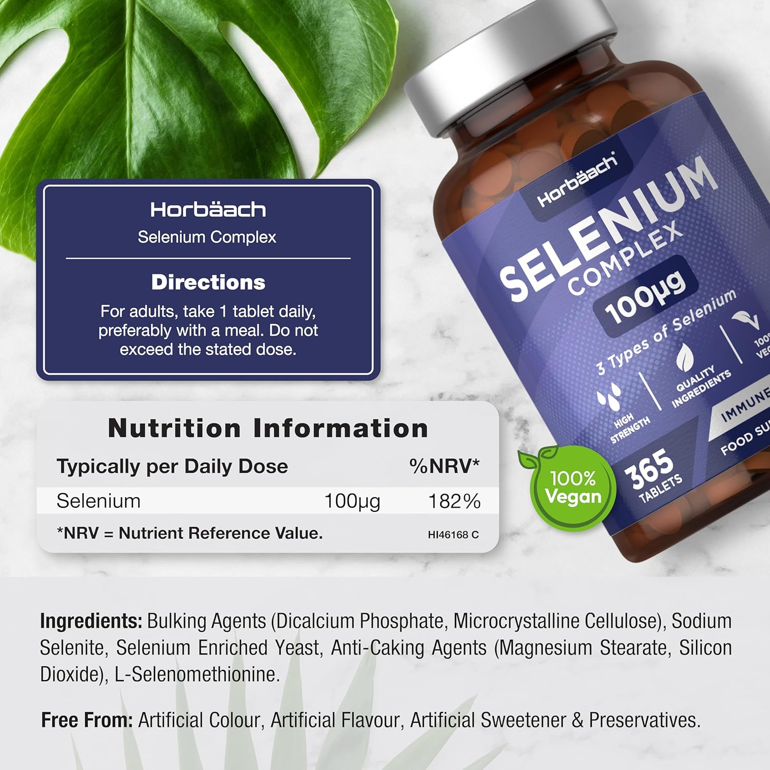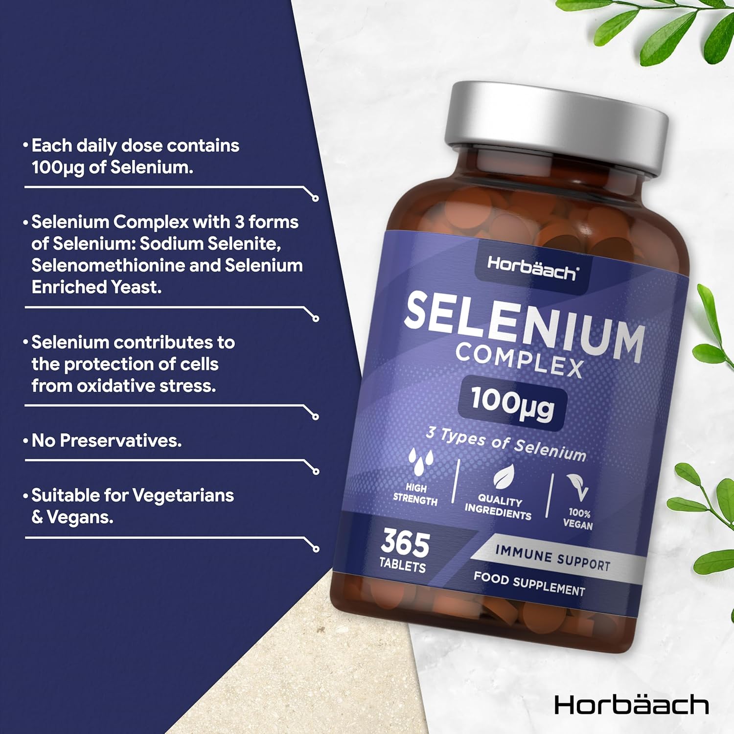 Selenium Supplement Complex 100µg | 1 Jaar Voorraad – 365 Veganistische Tabletten | Selenium Supplement | Premium Natriumseleniet, L-selenomethionine, Seleniumgist | Hoge Dosering | Horbaach