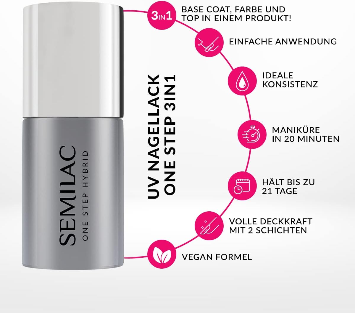 Quick and durable – manicure in 20 minutes – 2 layers are enough. Can be kept for up to 21 days.