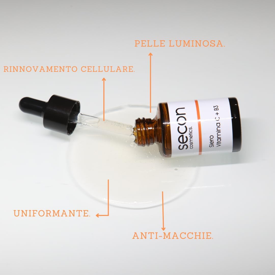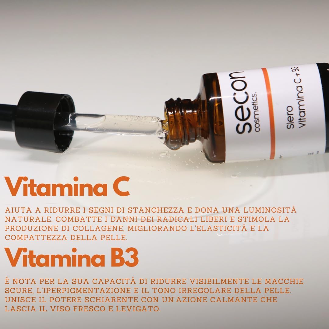 Breng de natuurlijke schoonheid van je huid tot leven met ons innovatieve gezichtsserum met vitamine C en niacinamide (B3), twee dermatologisch bewezen ingrediënten. Een concentraat van hoogwaardige ingrediënten die de tekenen van huidveroudering bestrijden en het huidbeeld zichtbaar verbeteren. De krachtige combinatie van vitamine C en niacinamide maakt dit serum tot de ideale behandeling om elke dag een stralender, gelijkmatiger en jeugdig gezicht te krijgen voor een gezond uitziende huid. Ons serum wordt geproduceerd in Italië. Het kan op alle huidtypes worden gebruikt, inclusief de gevoelige, droge en gemengde huid. Wij raden je aan om een test uit te voeren, omdat dit in zeldzame gevallen huidirritatie kan veroorzaken bij mensen die lijden aan een allergie voor een van de ingrediënten. Test 24 uur voor gebruik op een klein deel van de huid om de verdraagbaarheid met de huid te controleren. Bij contact met de ogen goed met koud water uitspoelen. Stop het gebruik als er aanhoudende irritatie optreedt. Buiten het bereik van kinderen bewaren. Alleen voor uitwendig gebruik.