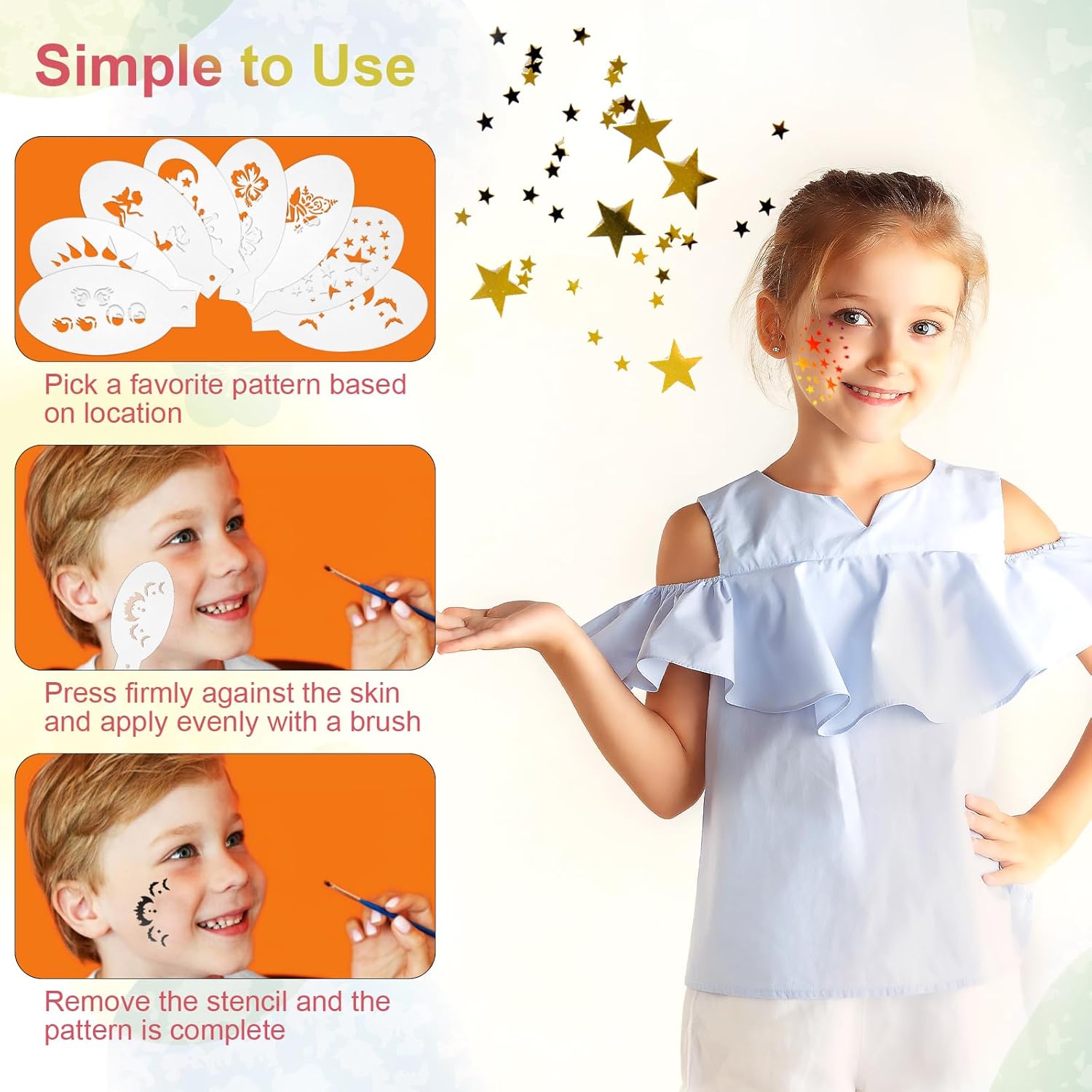 Eenvoudig in gebruik: elke kindermake-upsjabloon heeft een handig handvat dat je nauwkeurige plaatsing en controle tijdens het aanbrengen mogelijk maakt. Zelfs complexe ontwerpen zijn gemakkelijk te realiseren.