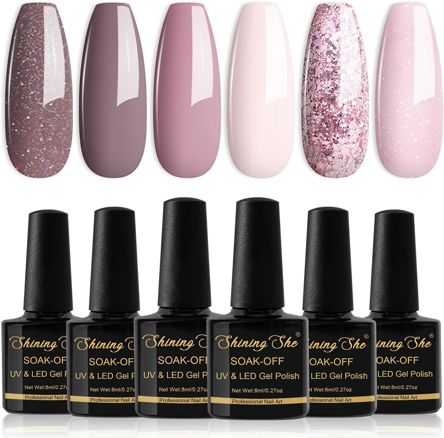 Shining She Gel Nail Polish,6 Farben Glitter Roze Donker Roze Licht Roze Naakt Kleuren Gel Nagellack Soak-Off UV Nagellack Set voor Beginners DIY Nail Art at Home, 8ml