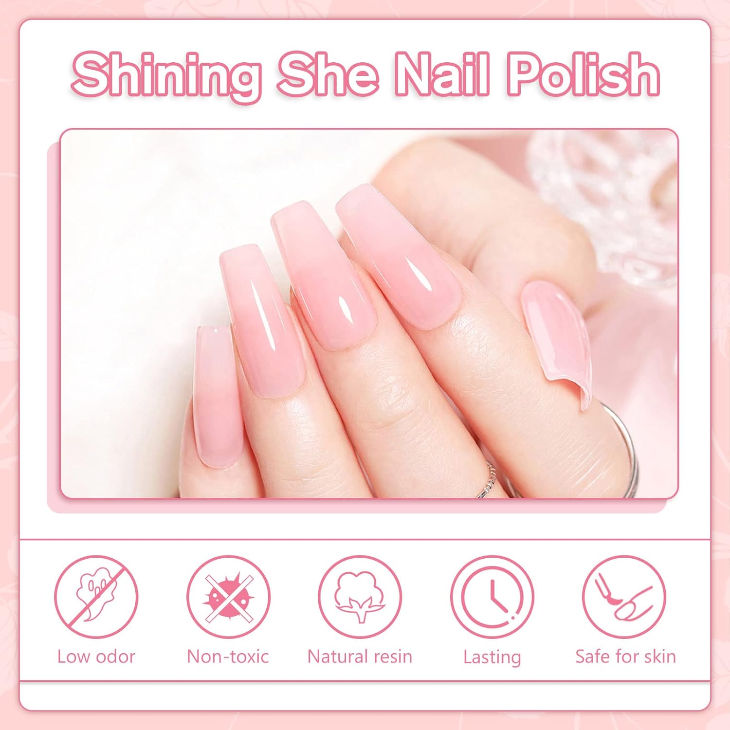 Natural material: Shining She nail polish is made of 100% natural resin, healthy, friendly, safe, non-toxic and odourless, does not damage nails and skin and use with confidence.