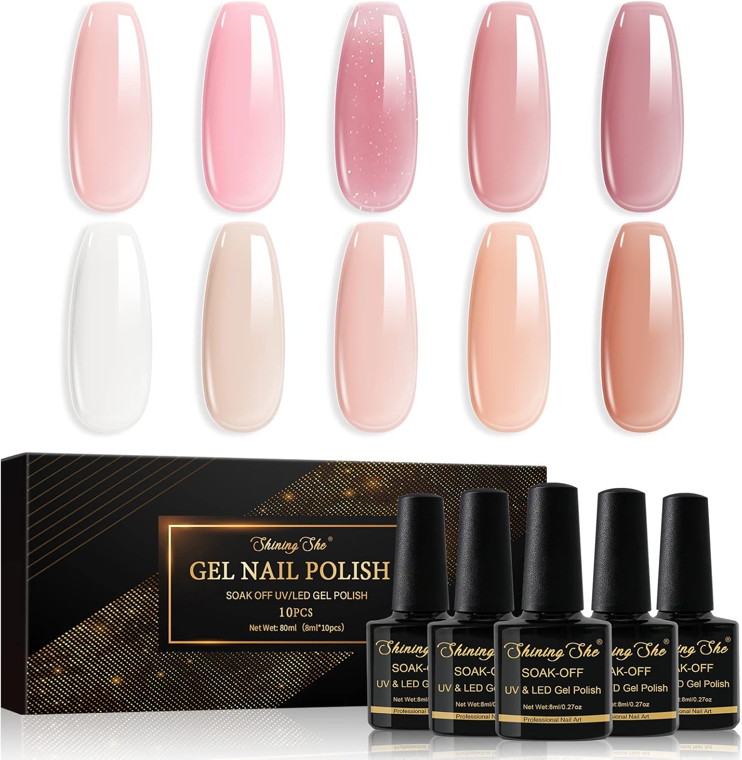 Shining She Gel Polish,10 Colors Jelly Gel Nail Polish Transparent Pink Nude Soak-Off UV Gel Nail Polish Manicure for Beginners DIY Salon,Nail Art Gifts for Women 8ML