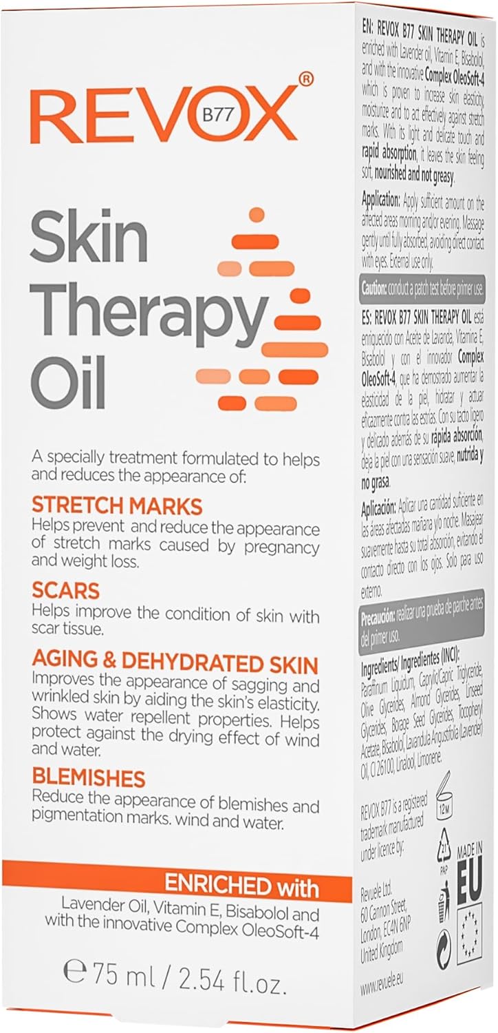 Zwangerschapsolie: Revox B77 Skin Therapy Oil is een speciale behandeling met snel intrekkende olie die het uiterlijk van striae, littekens, droge en verouderende huid en pigmentvlekken verbetert.