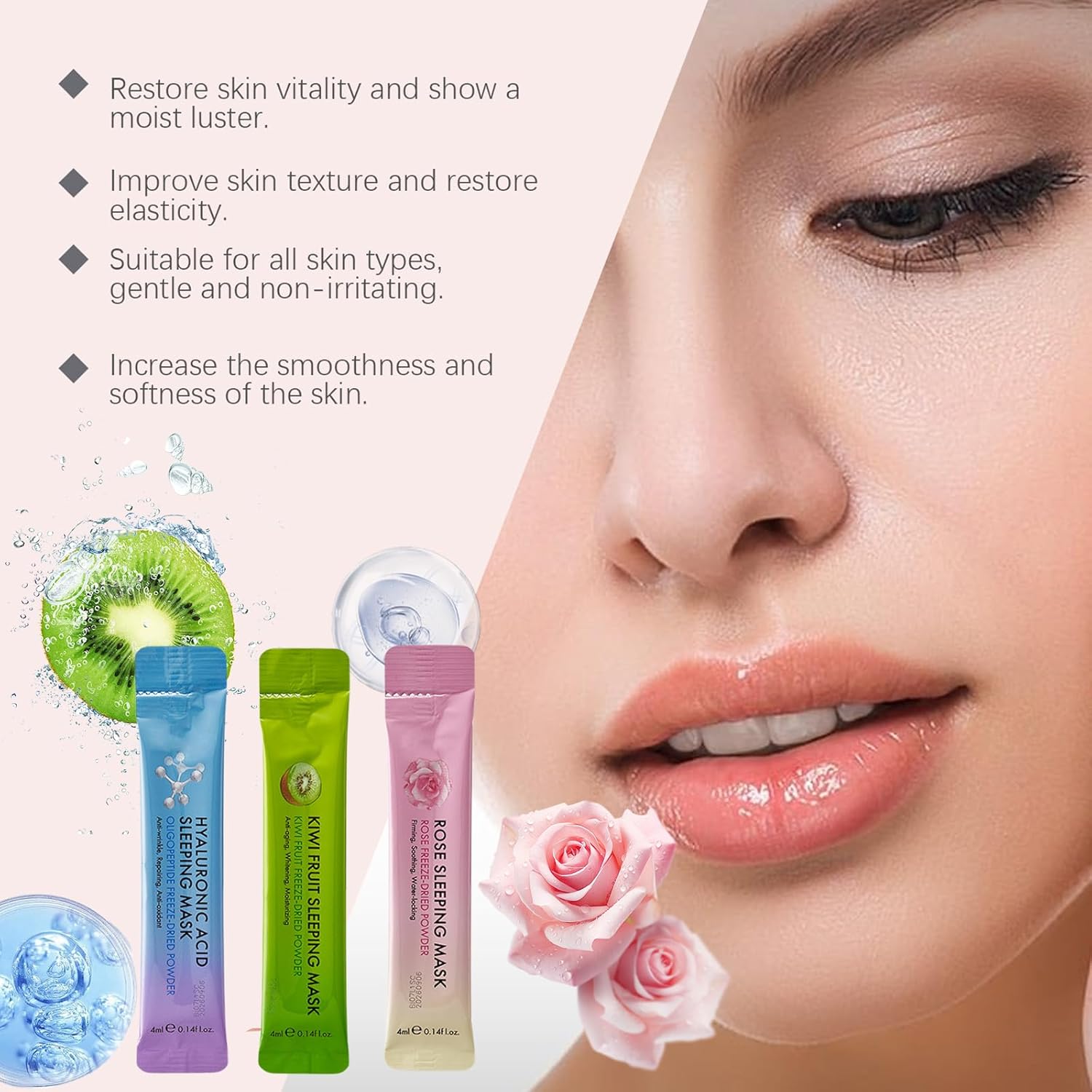Een verscheidenheid aan modellen voor elke huidbehoefte: deze set bevat 40 afzonderlijke 4 ml goedenachtmaskers, die in drie verschillende uitvoeringen verkrijgbaar zijn: hyaluronzuur slaapmasker voor intensieve hydratatie, rozenslaapmasker voor kalmering en kalmering en kiwi-slaapmasker voor het verlichten en revitaliseren van de huid ‘s nachts. Diep hydratatie en vochtafvoerend: het hyaluronzuur slaapmasker hydrateert intensief en houdt vocht in de huid vast terwijl je slaapt. Daardoor wordt de droge huid weer aangevuld en voelt hij ‘s ochtends mollig, glad en verfrist aan. Weldadig en kalmerend met rozenessence: het Rose Sleeping Mask is verrijkt met rozenextract, dat kalmerende eigenschappen heeft en helpt om geïrriteerde of gevoelige huid te kalmeren. Het helpt roodheid te verminderen, bevordert de ontspanning van de huid en zorgt voor een evenwichtige en gelijkmatige teint. Verhelderend en revitaliserend met KIWI-extract: het Kiwi-slaapmasker is ontworpen om vermoeide en vale huid op te fleuren en te revitaliseren. Het masker is rijk aan antioxidanten en vitamine C en helpt de huid te verjongen en de uitstraling te verbeteren, zodat het er ‘s ochtends fris en stralend uitziet. Eenvoudige en praktische huidverzorging voor de nacht: elk masker wordt geleverd in een portie van 4 ml voor eenmalig gebruik, waardoor het praktisch is voor onderweg of op reis. Breng het masker gewoon aan voor het slapengaan, laat het ‘s nachts intrekken en word wakker met een verzorgde, gladdere en jeugdige huid, zonder het af te spoelen.