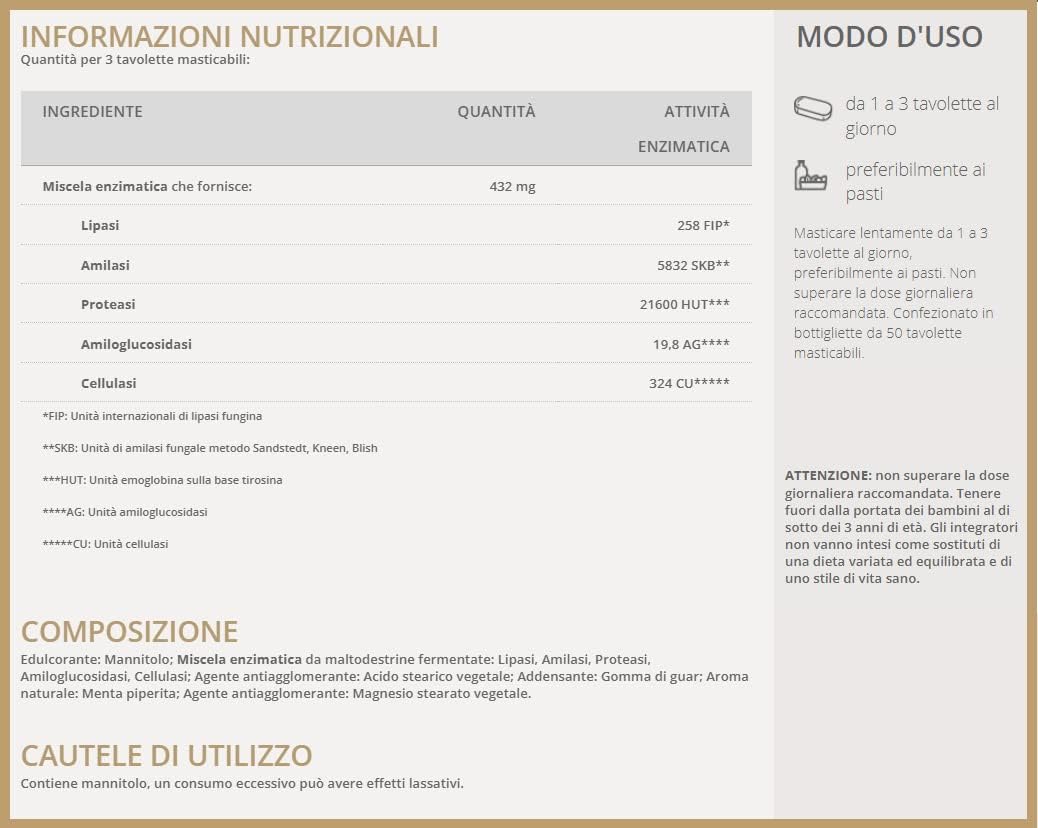 Het mengen van enzymen die de spijsvertering wekken. VEGAN MULTI DIGEST tabletten zijn cautabel en aangenaam gearomatiseerd met munt: ze bevatten een mengsel van enzymen die uit aspergillus worden gewonnen, met name proteasen, amylase, amyloglucosidase en lipase. Dergelijke enzymen zijn fysiologisch aanwezig in het lichaam en worden gebruikt om eiwitten, koolhydraten en vetten te verteren. In de moderne levensstijl zijn er echter talrijke factoren die enzymtekorten kunnen veroorzaken: onevenwichtige voeding, voorgekookt, slecht gekookt of behandeld voedsel, alcoholische dranken, onvoldoende kauwen. Bij verminderde enzymatische efficiëntie kan een enzympreparaat nuttig zijn. Vegan Multi Digest bevat bovendien het enzym cellulase.