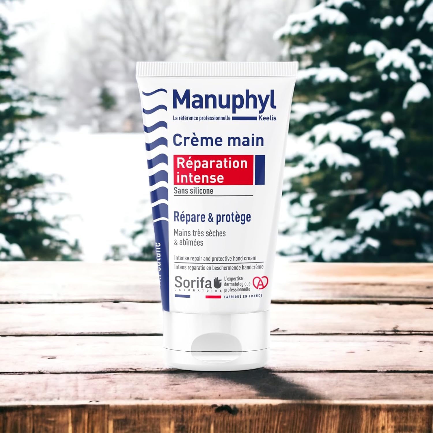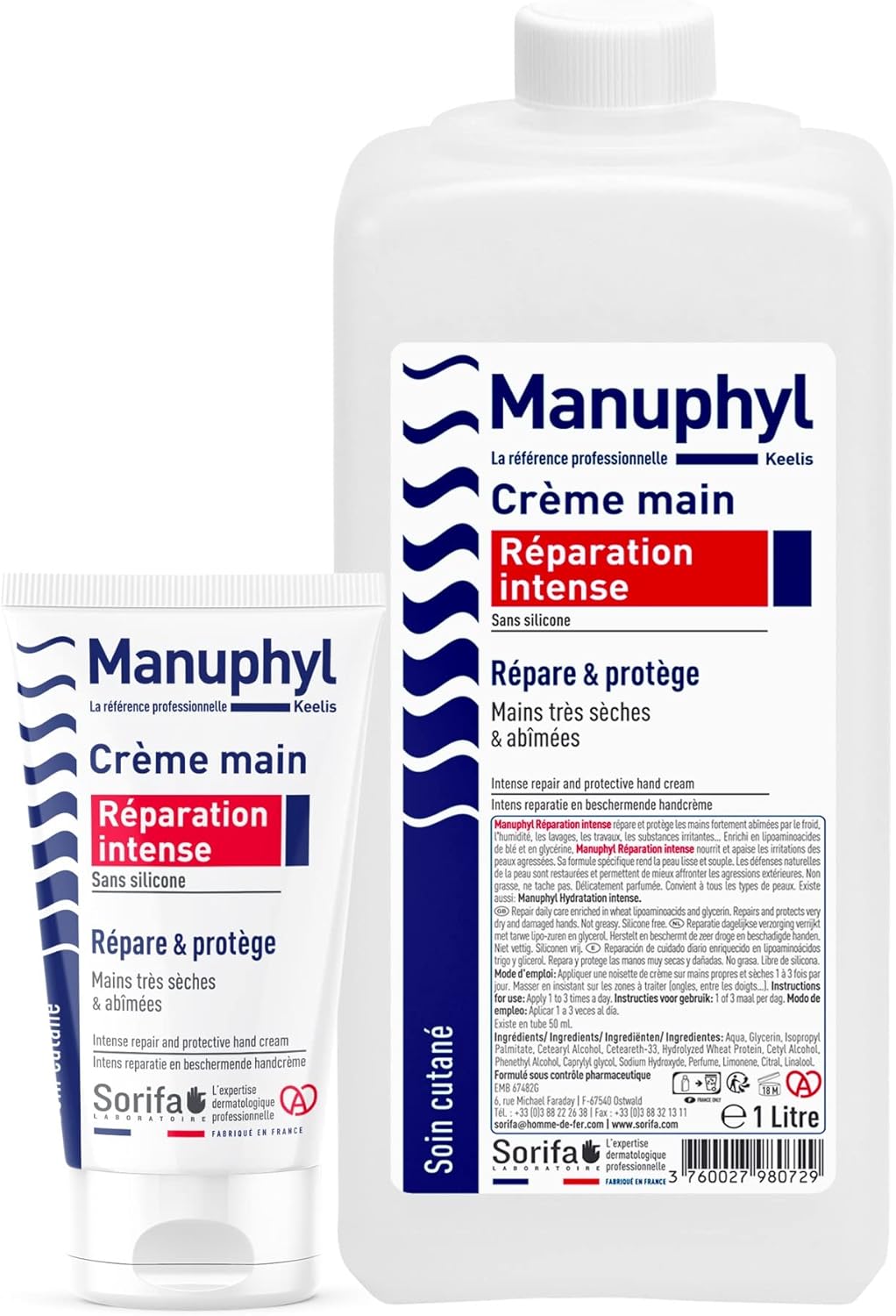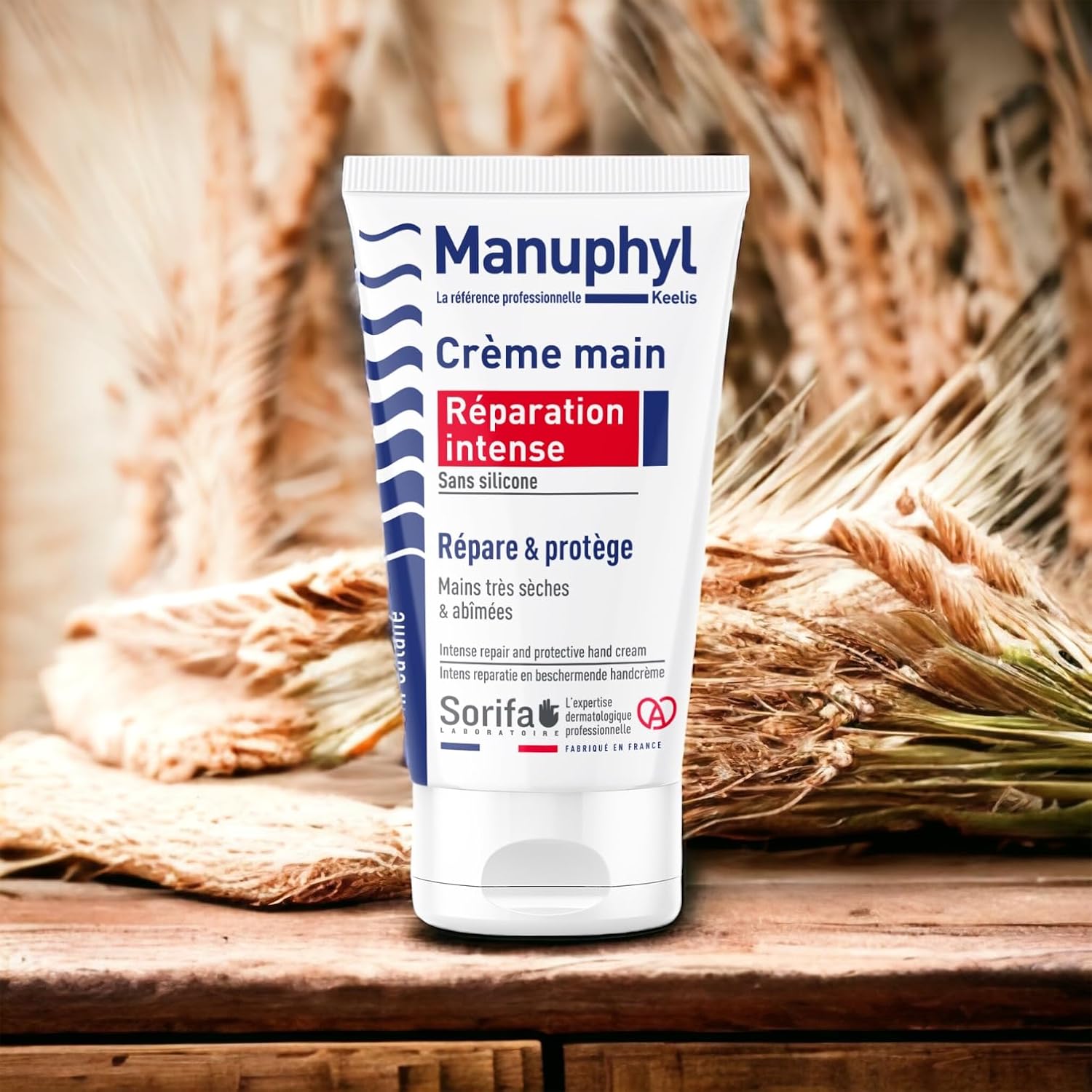 Manuphyl intensieve reparatie is een volledig antwoord op de dagelijkse irritaties van de handen, die sterk door kou, vocht, herhaaldelijk wassen, werken en irriterende stoffen worden beschadigd. Verrijkt met tarwe-eiwitten met hydraterende en filmvormende eigenschappen en plantaardige glycerine met hydraterende en verzachtende eigenschappen. Manuphyl intensieve reparatie verzorgt en kalmeert irritaties van de aangetaste huid. De speciale formule maakt de huid glad en soepel. De natuurlijke afweer van de huid wordt hersteld en maakt een betere bestrijding van invloeden van buitenaf mogelijk. De formule is vetvrij en laat geen vlekken achter. Zacht geurend, geschikt voor alle huidtypes, ook voor de gevoelige huid. Werking: de huid ervaart meerdere dagelijkse invloeden. Het verlies van integriteit en de samenhang van de oppervlaktelaten van de epidermis is de eerste fase van droogheid. Manuphyl handcrème intensieve reparatie, dankzij de met tarweproteïnen verrijkte formule compenseert het zuurtekort van de aangetaste huid, brengt de pH-waarde terug naar de normale waarde en helpt bij het behoud van een normale hydratatiesnelheid. De glycerine in Manuphyl handcrème helpt de huid om zijn soepelheid te herkrijgen, natuurlijke roos door zijn hydraterende kracht te reguleren. Zo kan de huid zijn rol als bescherming van de diepe dermis tegen invloeden van buitenaf garanderen. Ook verkrijgbaar: Manuphyl intensieve vochtigheid. Gemaakt in Frankrijk onder farmaceutische controle.