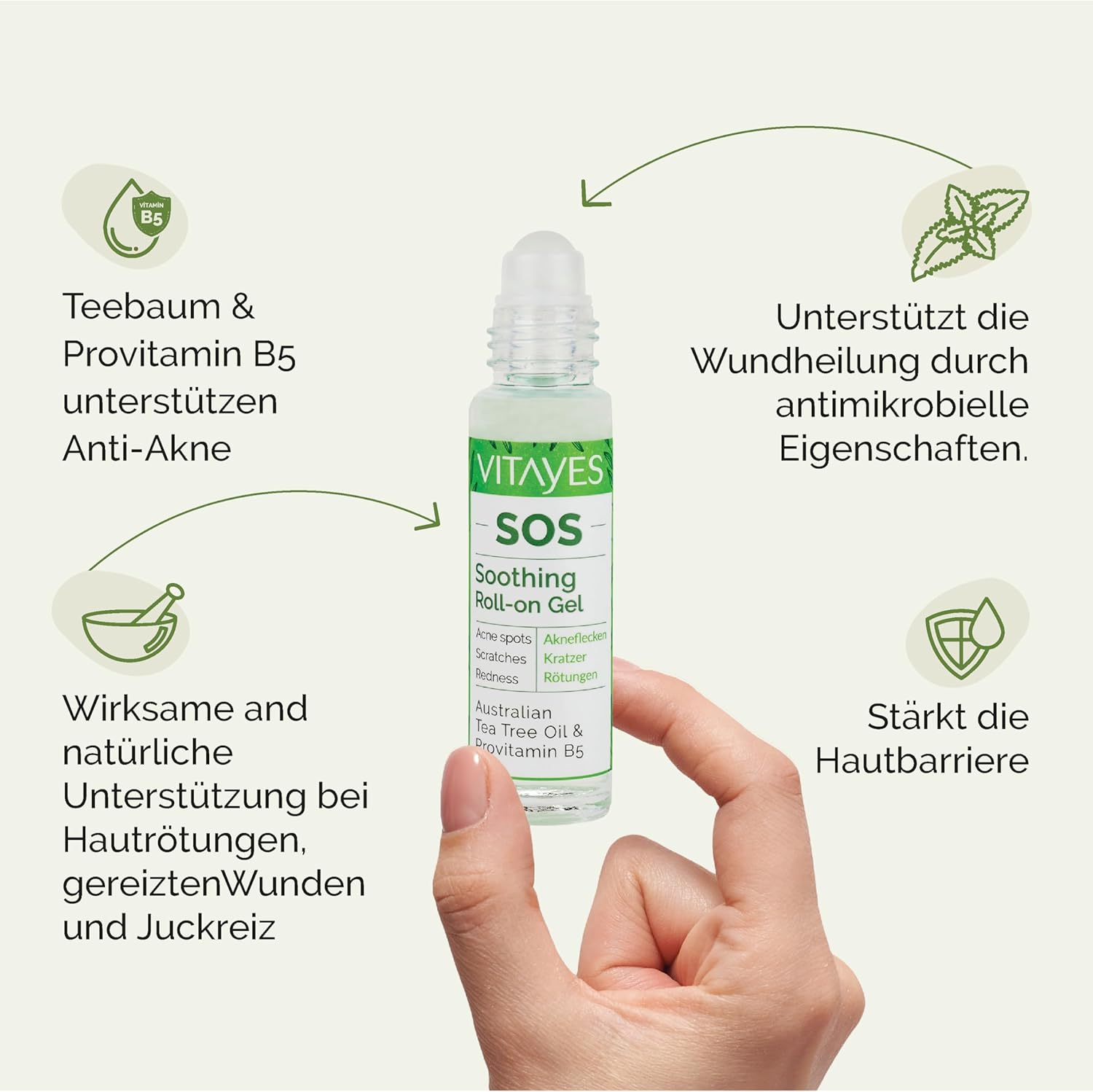 SOS Tea Tree Oil Roller, vitamine B5, tegen acnevlekken, krassen, huidontstekingen, kalmerende roll-on pen, puistjes, onzuivere huid, veganistisch, reparerend, tegen roodheid van de huid, 10