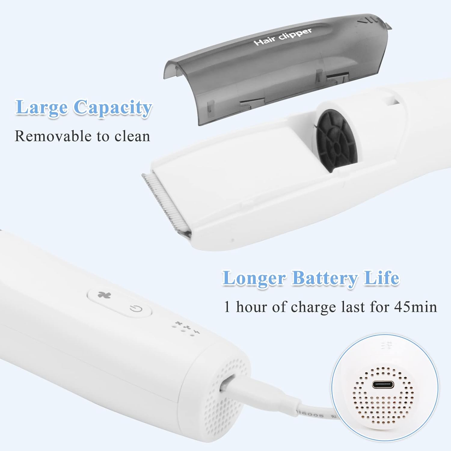 Dubbele motoraandrijving: deze babyhaartrimmer wordt geleverd met dubbele motoren. Het heeft een sterke zuigkracht zonder veel lawaai te maken. Het veroorzaakt ook geen haarbreuk. Haar knippen en zuigen kan onafhankelijk of gelijktijdig worden bediend