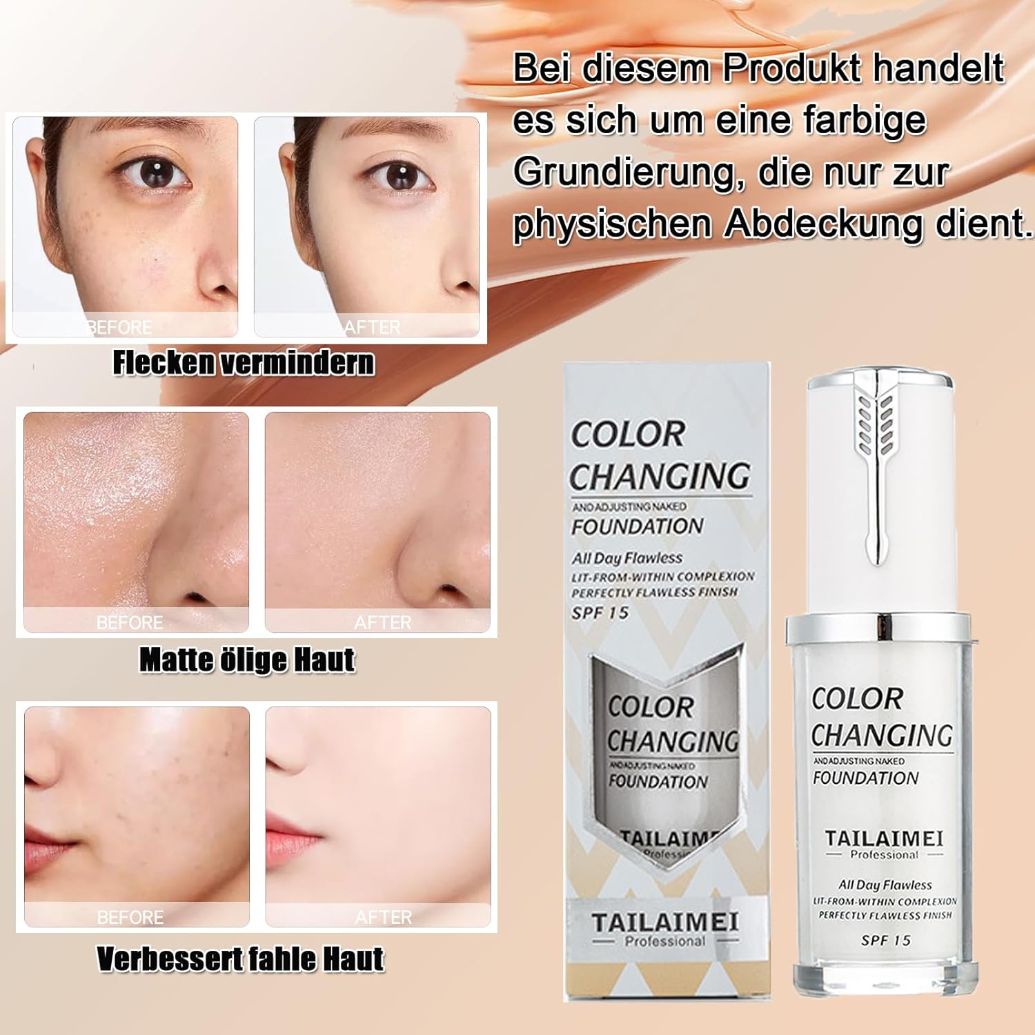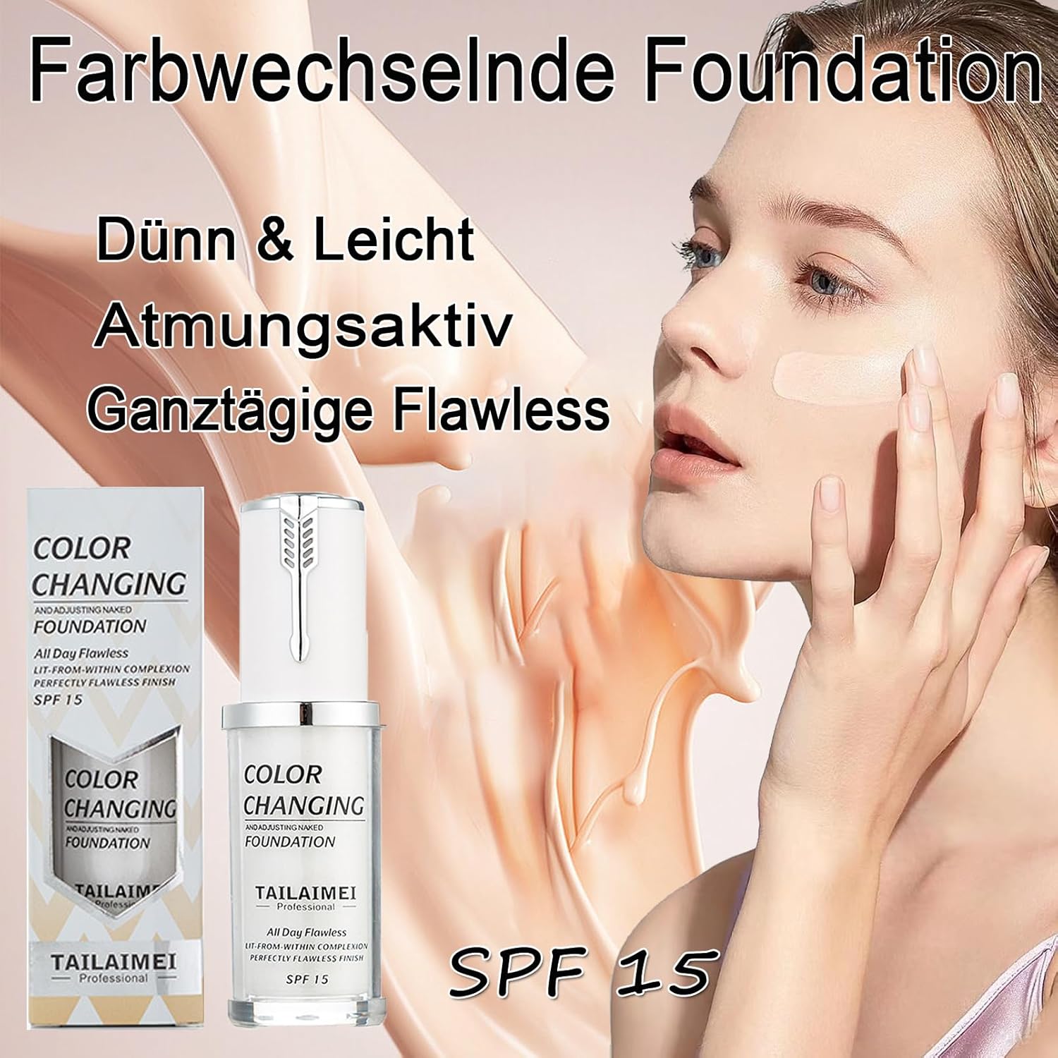 SPF 15 Warme foundation, kleurverandering, flawless concealer, foundation, make-up, ademende & lichte vloeibare foundation, waterdichte witte foundation, kleurveranderende foundation, voor een lichte