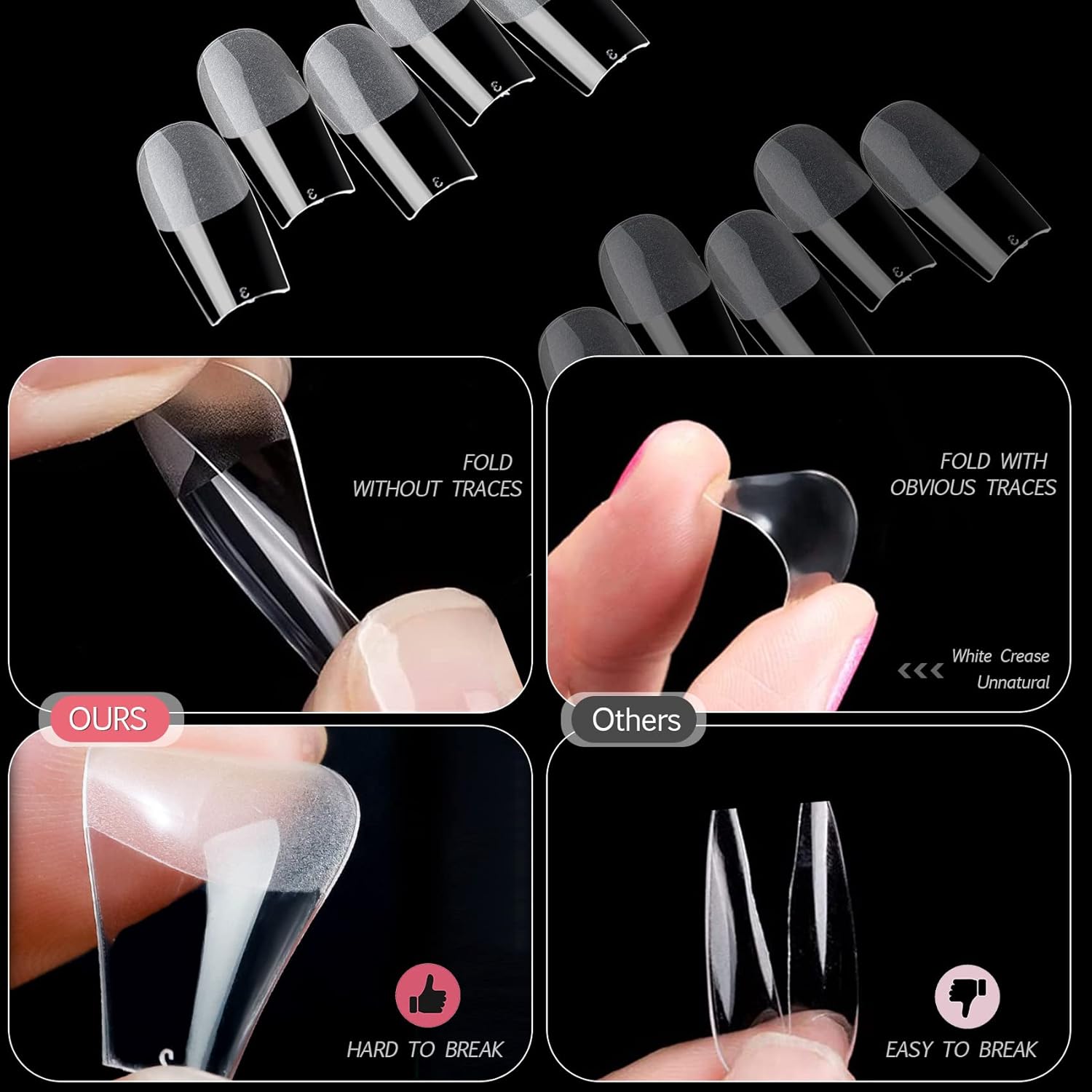 ULTRA-thin and comfortable: Acrylic nail tips are made from the soft soaking gel material instead of the traditional cheap ABS material. This means thinner, malleable and more natural. Don’t worry about breaking or leaving creaseEasy to apply, pre-shaped, long-lasting, soaked nail extension kit.