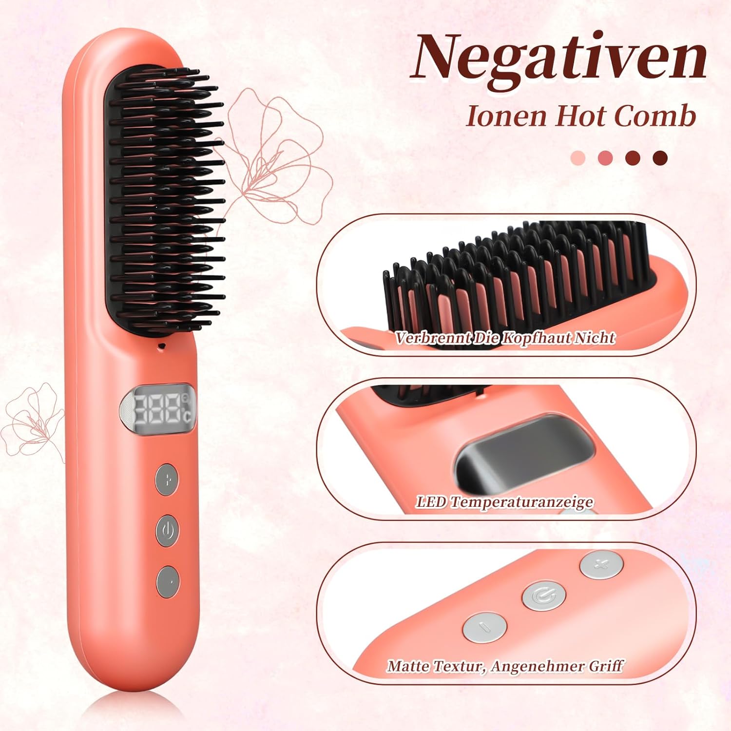 Stijlborstel, draagbare haarstraightener, mini-elektrische haarborstel met 9 temperatuurinstellingen, negatieve ionen hot comb, 150 °C – 230 °C, anti-verbranding stijltang, draadloos lcd-scherm (roze)