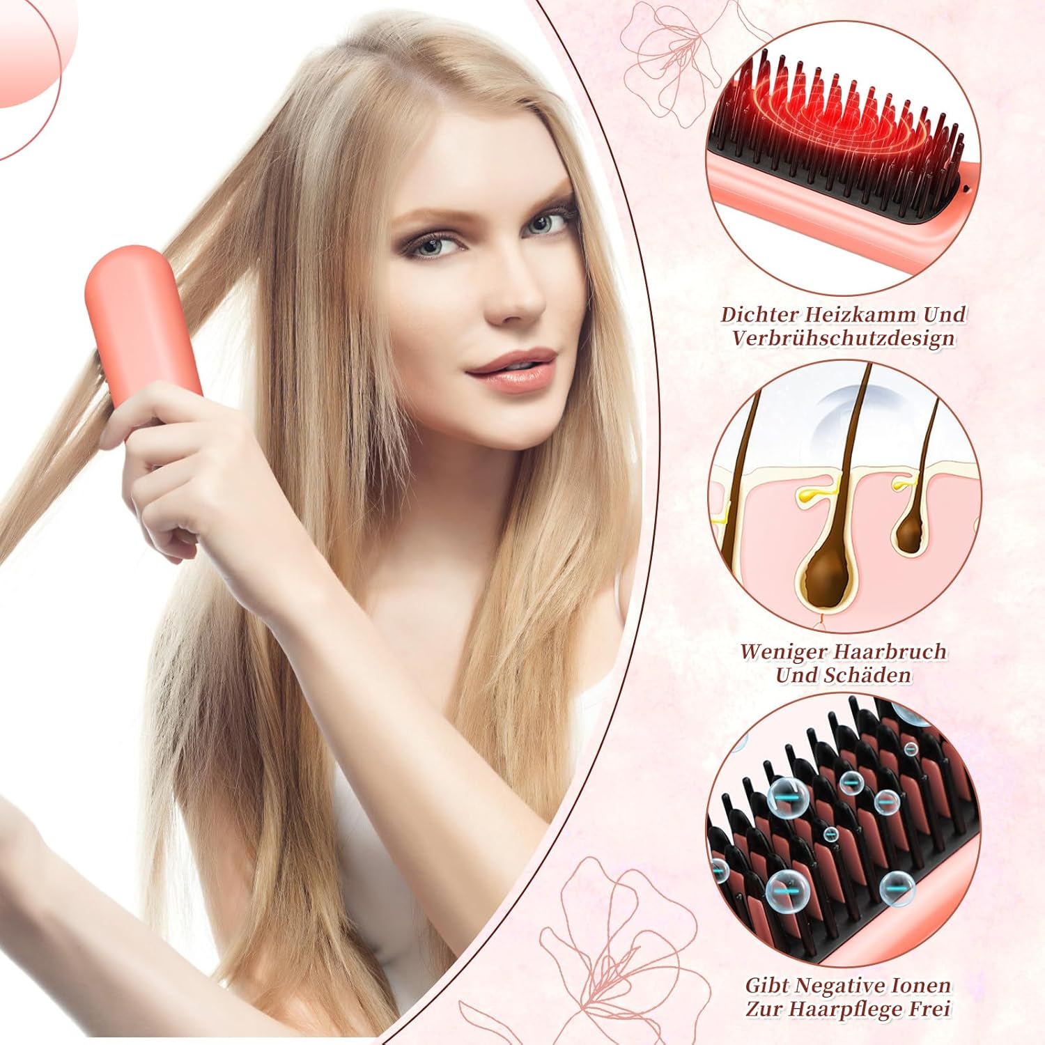 1ste Haarverzorging met 200 miljoen negatieve lonen: bij verhitting zet de stijlborstel 200 miljoen negatieve lonen, die gemakkelijk in het haar kunnen doordringen, zeg vaarwel tegen rommelig haar.