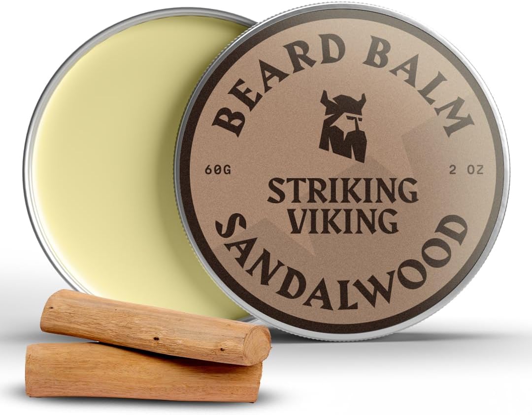 Striking Viking Sandelhout baardbalsem – Stijlt, versterkt en verzacht baarden en snorren – 100 procent natuurlijke baardconditioner met biologische sheaboter, tea tree, argan- en jojoba-olie