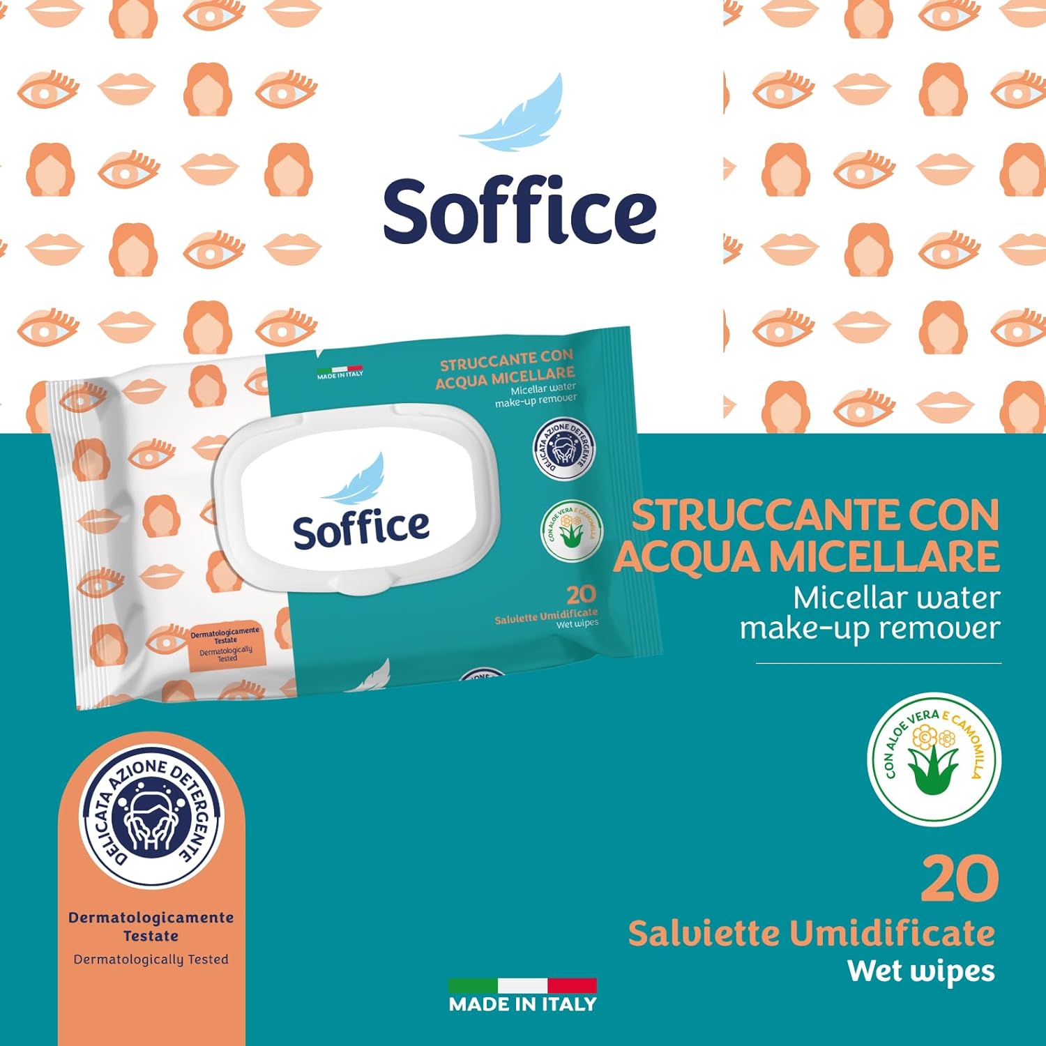 Pakket kan variëren. De micellaire make-upverwijderingsdoekjes van Soffice in de praktische openings- en sluitverpakking zijn zacht, geurig en duurzaam. Ze verwijderen gemakkelijk make-up van het gezicht en verfrissen je huid dagelijks. Reinigingsoplossing verrijkt met panthenol, aloë en amandelolie. 1 pak x 20 doeken