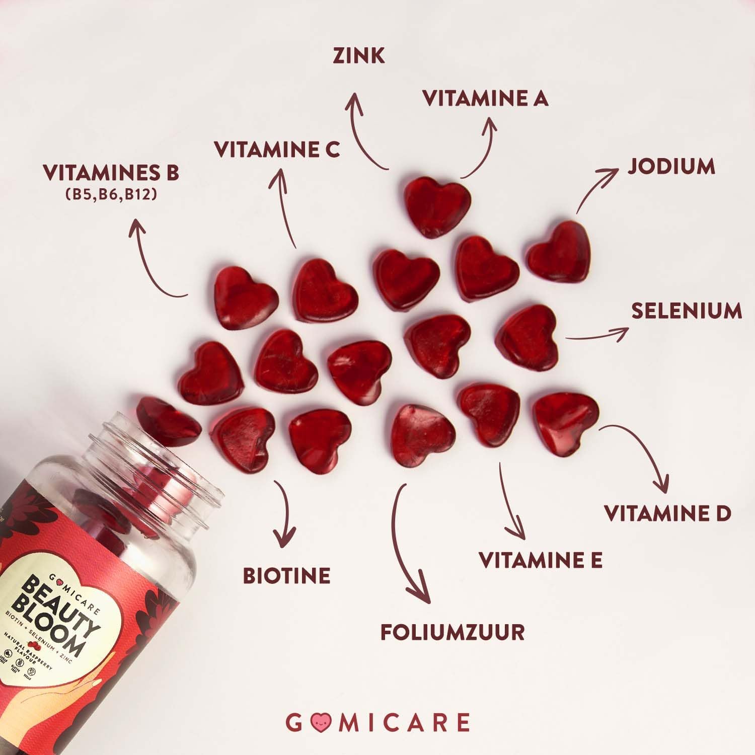 Ontdek het plezier van schoonheid: met Gomicare Beauty Bloom verander je je schoonheidsroutine in een moment van puur genot. Onze natuurlijke frambozensnoepjes zijn meer dan alleen een supplement: ze zijn een dagelijkse verzorging voor glanzend haar, een stralende huid en sterke nagels. Slechts 2 snoepjes per dag voor welzijn dat zichtbaar en voelbaar is.