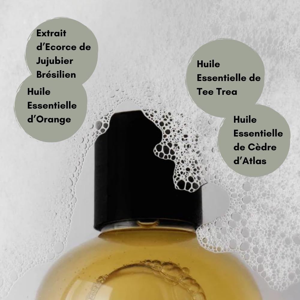 Deze shampoo bevat Jujube schors, Tea Tree etherische olie, Atlas ceder etherische olie en sinaasappel.