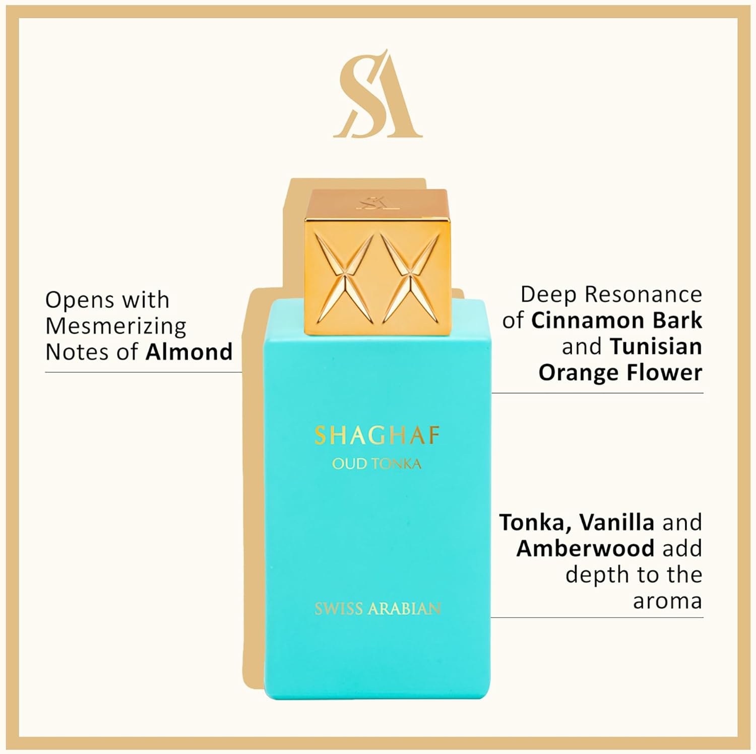 Swiss Arabian Shaghaf Oud Tonka 75ml – Eau de parfum voor mannen en vrouwen – Oosterse vanillegeur – verfrissende, langhoudende eau de cologne en aftershave
