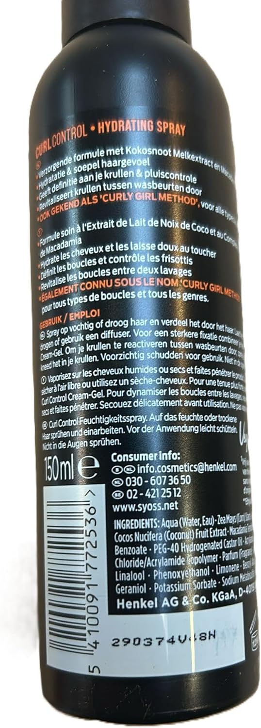 Syoss Haarspray, curl control, 150 ml Syoss Curl Control-spray geeft je krullen definitie en veerkracht. Het hydrateert je haar, controleert kroezen en geeft het haar een soepel gevoel. De voedende formule met kokosmelk-extract en macadamia-oliecomplex revitaliseert je krullen tussen de wasbeurten. Veganistische formule zonder siliconen en alcohol.