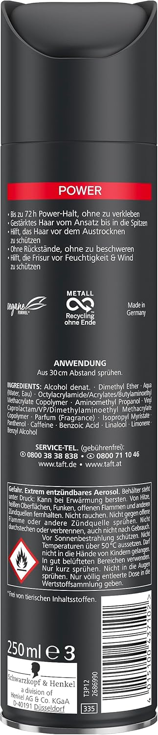 Productbeschrijvingen: de Taft Power haarlak versterkt je haar vanaf de wortel tot in de punten. De innovatieve formule biedt tot 72 uur grip zonder resten achter te laten. Deze haarlak helpt je haar tegen uitdrogen te beschermen zonder het te verzwaren. Hij geeft je styling ook bij vocht en wind powerhoud. Taft haarlakken gebruiken veganistische formules en zijn vrij van dierlijke ingrediënten. Gebruik: spuiten vanaf 30 cm afstand.