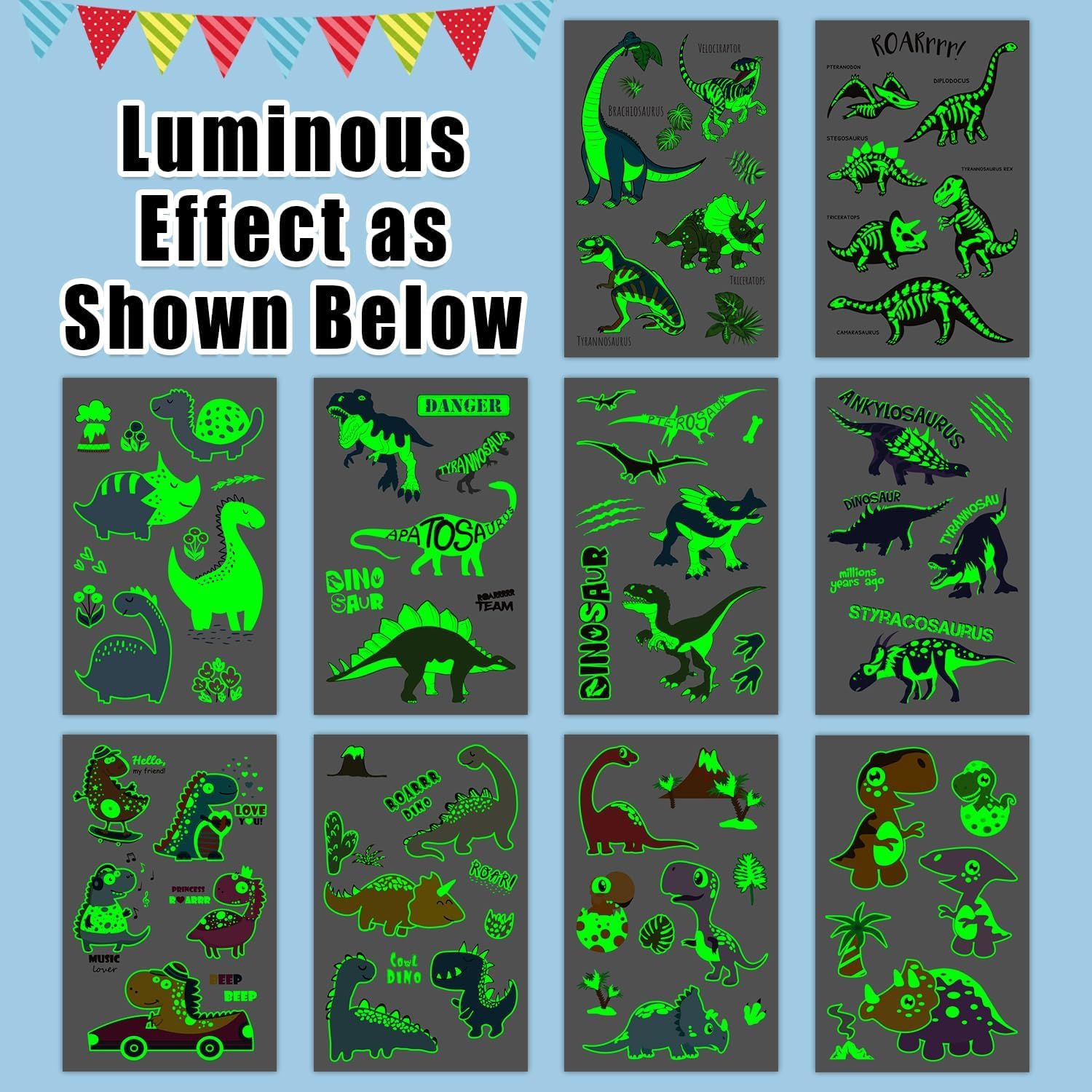 Dinosaur luminous tattoos for children: 10 sheets of dinosaur stickers, with cool light effects in the dark and carefully designed dinosaur motifs, offer your children different and surprising experiences, day and night.