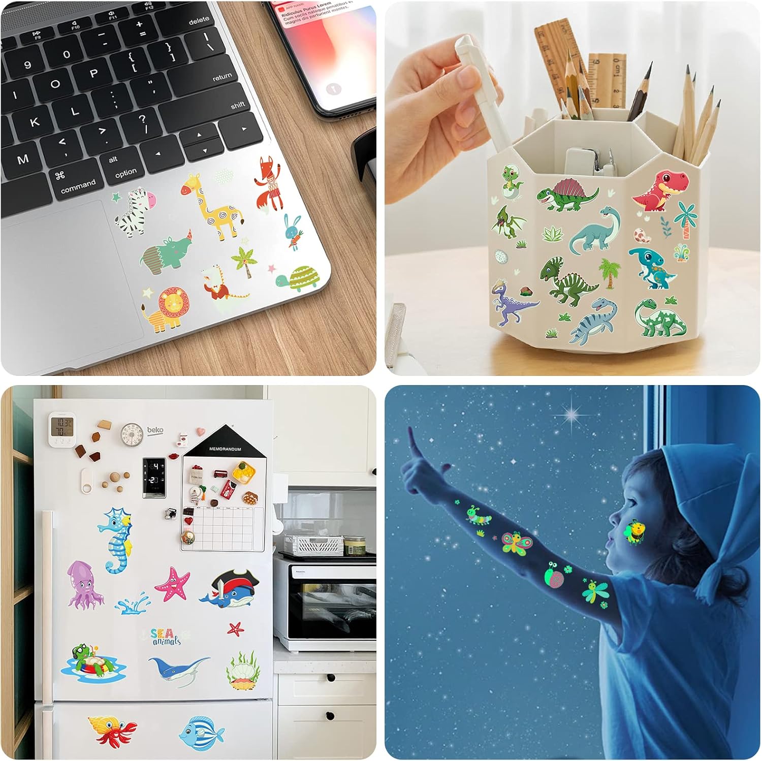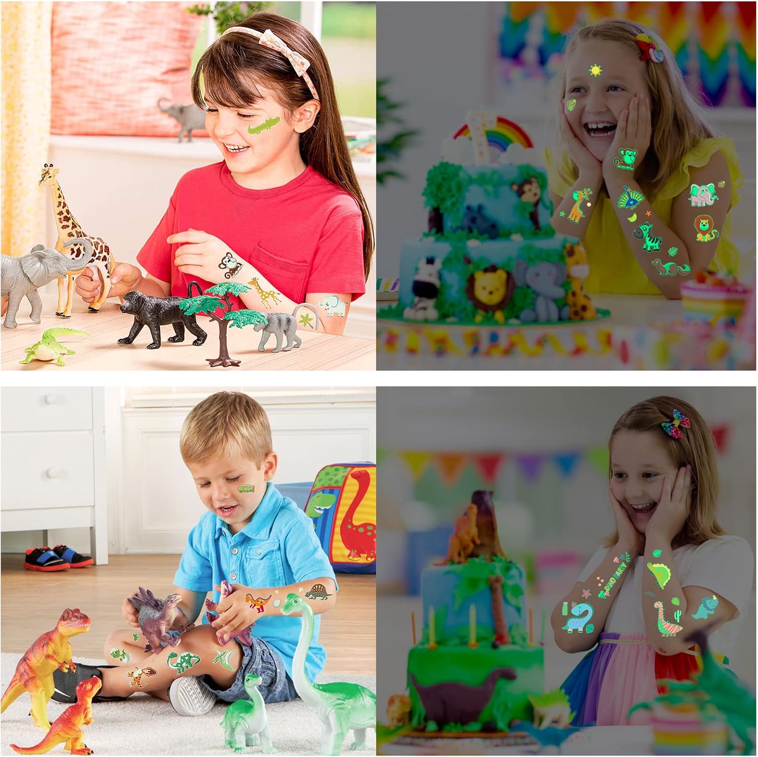Multiple Themes Tattoos Children: You will receive 30 sheets of glow in the dark children’s tattoos (400).including dinosaur panda tiger elephant giraffe whale sharks crabs turtles octopus butterflies dragonflies etc.
