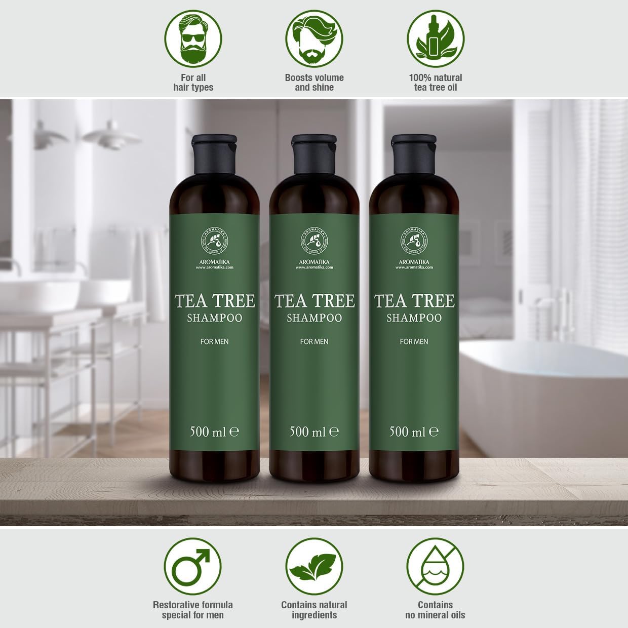 NATUURLIJKE SHAMPOO VOOR MANNEN – De Tea Tree shampoo is gemixt met Indiase kruisbes en rozemarijn. De perfecte natuurlijke samenstelling voor de dagelijkse verzorging van het haar en de hoofdhuid. De Tea Tree olie maakt het haar zeer gemakkelijk te behandelen, geeft alle haartypes een gezonde glans en heeft een herstellende werking.