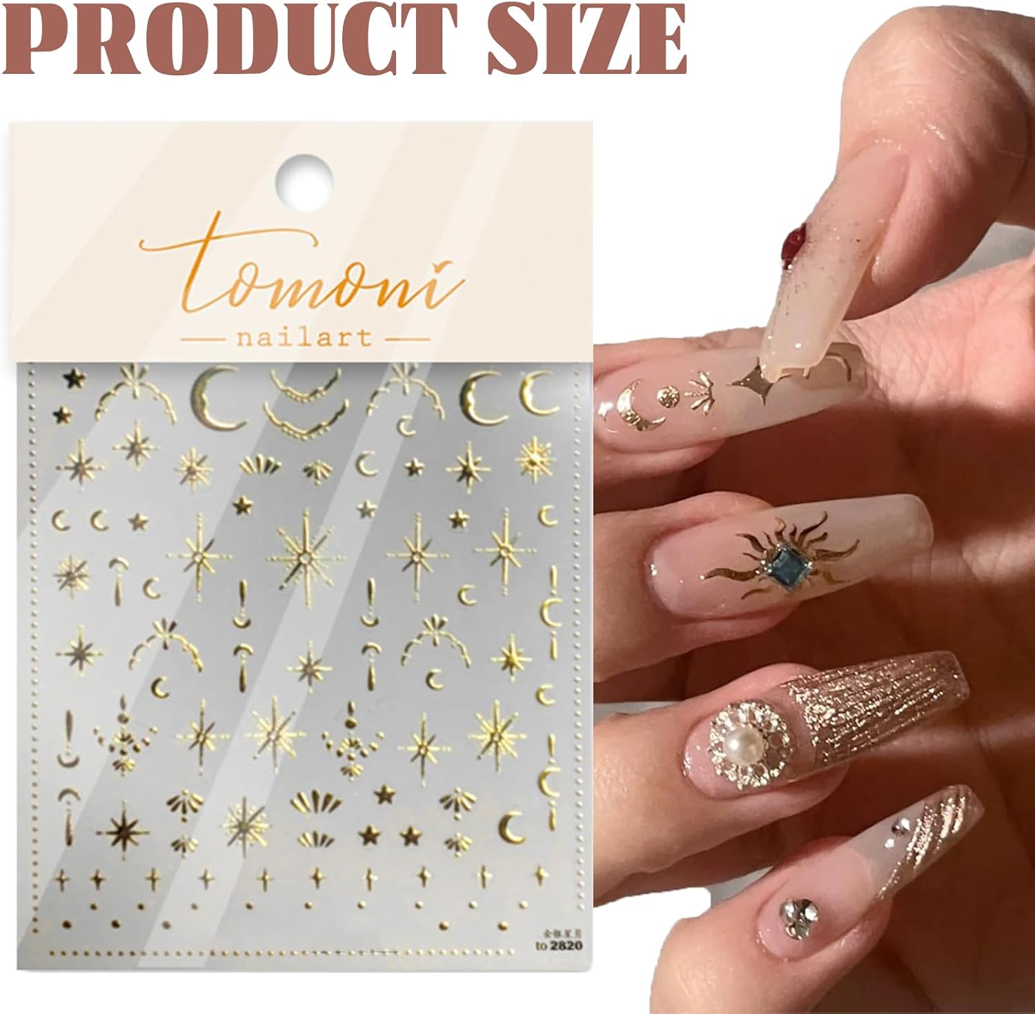 TELAIN 3D-nagelstickers met maan- en sterdesign, zelfklevende nagelstickers met gouden reliëf, perfect voor professioneel nageldesign thuis