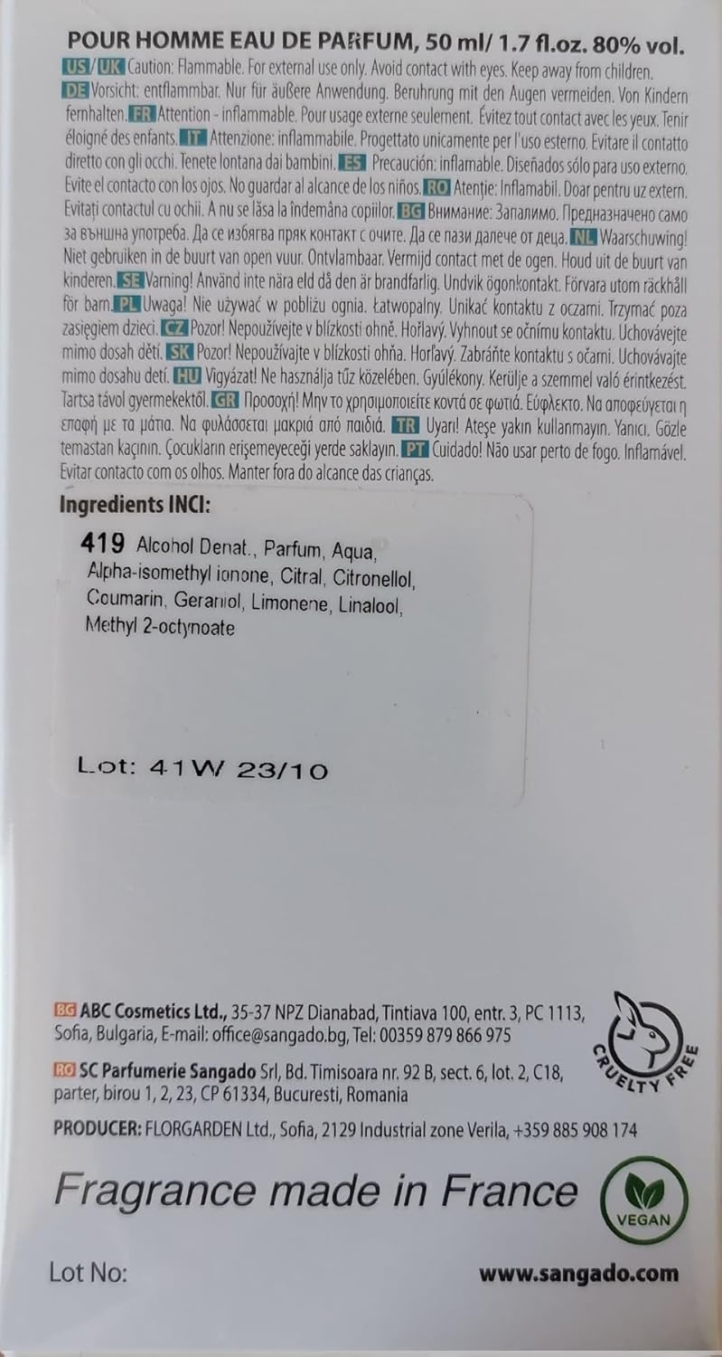 SANGADO GEUREN ZIJN GEBASEERD OP FIJNE INGREDIËNTEN VAN HOGE KWALITEIT. Het merk SANGADO werd gecreëerd door Parfumeur-Créateur Daniel Sangado. Onze parfums zijn gebaseerd op zuivere Franse essentiële oliën van topkwaliteit. Deze zorgvuldig geselecteerde superieure essentiële oliën zijn het echte werk en staan garant voor de kwaliteit van onze parfums. Ze zijn rijk aan karakter over het hele spectrum van noten (top, midden en bodem) die harmonieus voelbaar zijn naarmate de geur zich in de tijd ontvouwt. Wij geloven dat we absoluut de best mogelijke ingrediënten gebruiken voor een goedkoop parfum.